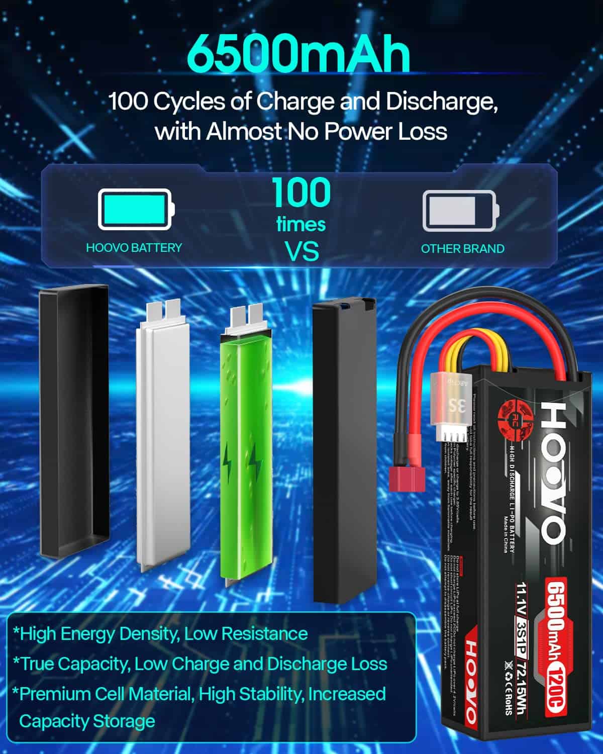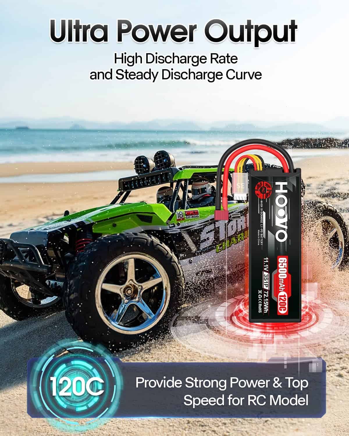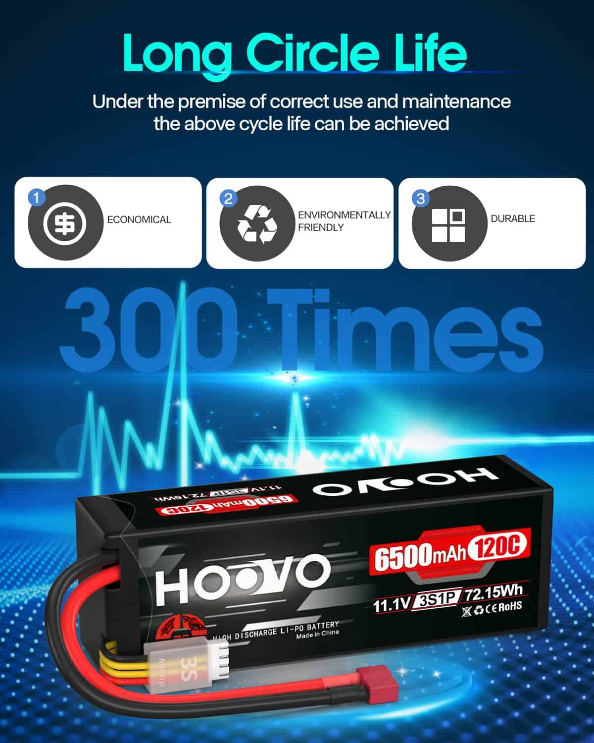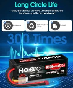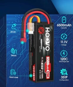 La batería de Lipo HOOVO 3S de 11.1V y 6500mAh con estuche rígido y tapa de Deans T es una opción ideal para los entusiastas de los vehículos RC que buscan un rendimiento excepcional. Con una vida útil de ciclo largo de al menos 150 veces, esta batería ofrece más tiempo de funcionamiento para disfrutar de tus actividades. Con una densidad de energía de hasta 200Wh/kg, esta batería proporciona una potencia duradera para tus necesidades de RC.
