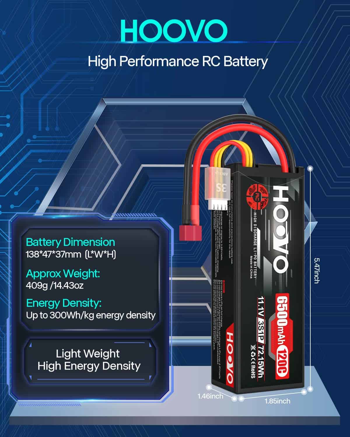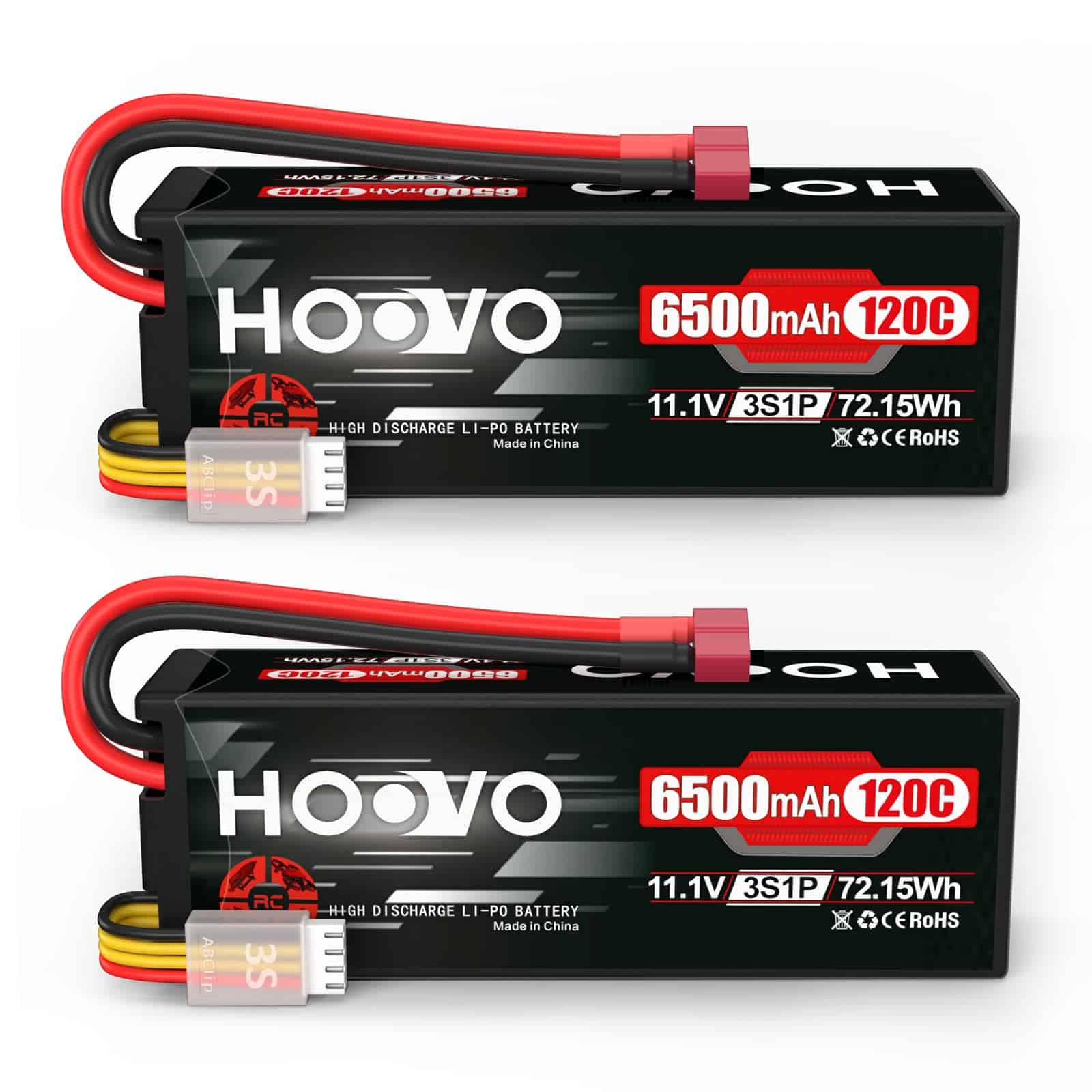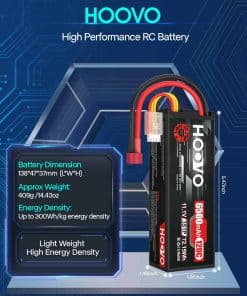 Con dimensiones de 138 x 47 x 37 mm y un peso de 409g, esta batería compacta y ligera es fácil de transportar y montar en tus vehículos RC. Su estuche rígido proporciona una protección adicional para un uso seguro y duradero. Obtén este paquete de 2 baterías Hoovo 3S 11.1V 120C 6500mAh T Plug y disfruta de la calidad y rendimiento superiores que ofrecen.