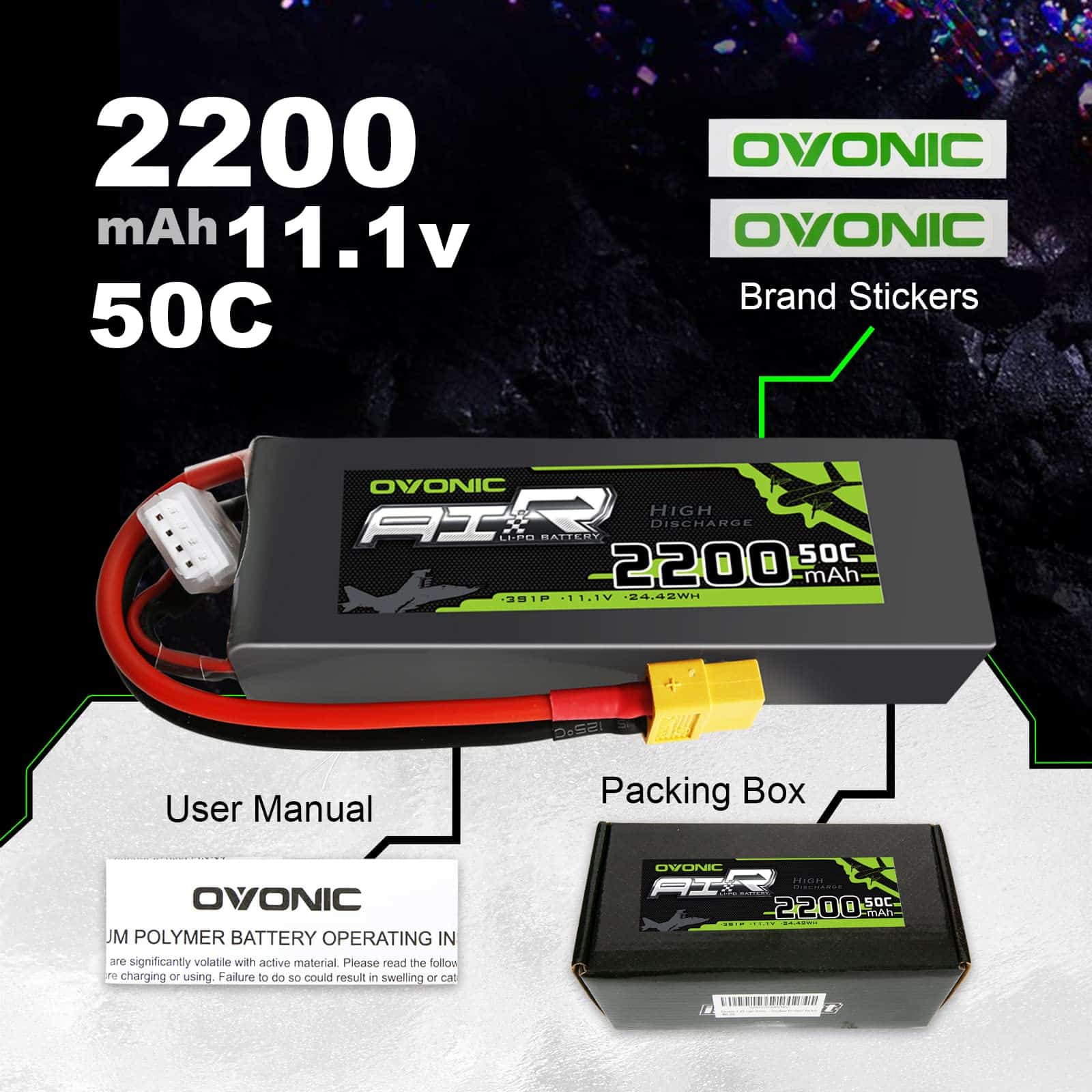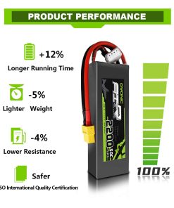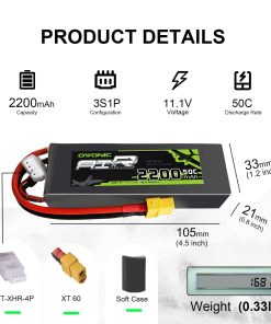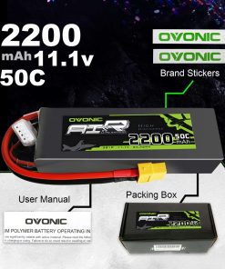 Especificaciones: Número de celdas: 3 Voltaje: 11.1V Capacidad mínima: 2200mAh Descarga: 50C Conector de carga: JST-XH-3P Conector de descarga: Conector XT60 Dimensiones de la batería: 105 33 21mm Peso de la batería: 168g Compatible con: 800MM Warbirds; EPP 3D plane; pequeño helicóptero QAV180/210; Walkera E22;450 Quad QAV250; DJI Phantom; Cuadricóptero; DJI Phantom FC40 Contenido del paquete: 2 baterías de Lipo Ovonic 3S 11.1V 2200mAh 50C con Conector XT60 para RC Evader BX Car, RC Truck, RC Truggy RC Airplane UAV Drone FPV Nota: Todas las baterías están listas para usar, seleccione el conector correcto según su batería original. Al mismo tiempo, por favor compare gentilmente las dimensiones con su batería original. Si tiene alguna otra demanda especial o problema, no dude en contactarnos.