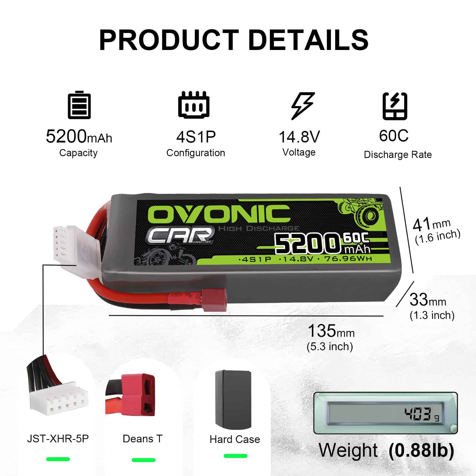 2. Especificaciones – Dimensiones de la Batería de Lipo OVONIC 5200mAh 14.8V(3mm): 153X46X31mm / 6.02×1.81×1.22 pulgadas (Largo Ancho Alto), Peso Aproximado(5g): 470g / 1.04 libras.