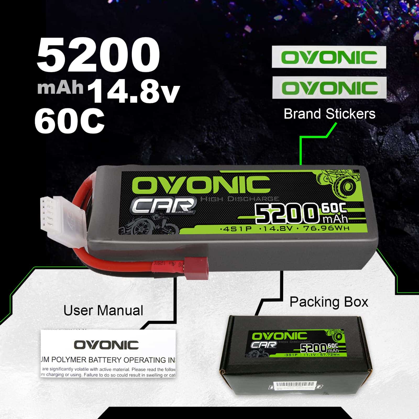 5. Paquete – Batería de Lipo 4S OVONIC, 2x Pegatinas de marca, Manual de usuario. Por favor, lea el manual de usuario cuidadosamente antes de usarlo, si tiene algún problema, contáctenos directamente y le responderemos en un plazo de 24 horas