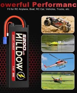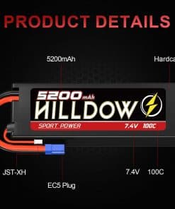 2. Dimensiones y Peso – La batería rc Hilldow 2s de 5200mAh mide: 138 47 25 mm / 5.43 1.85 0.98 pulgadas (L A H); Peso de una sola batería: 310g / 8.71oz.