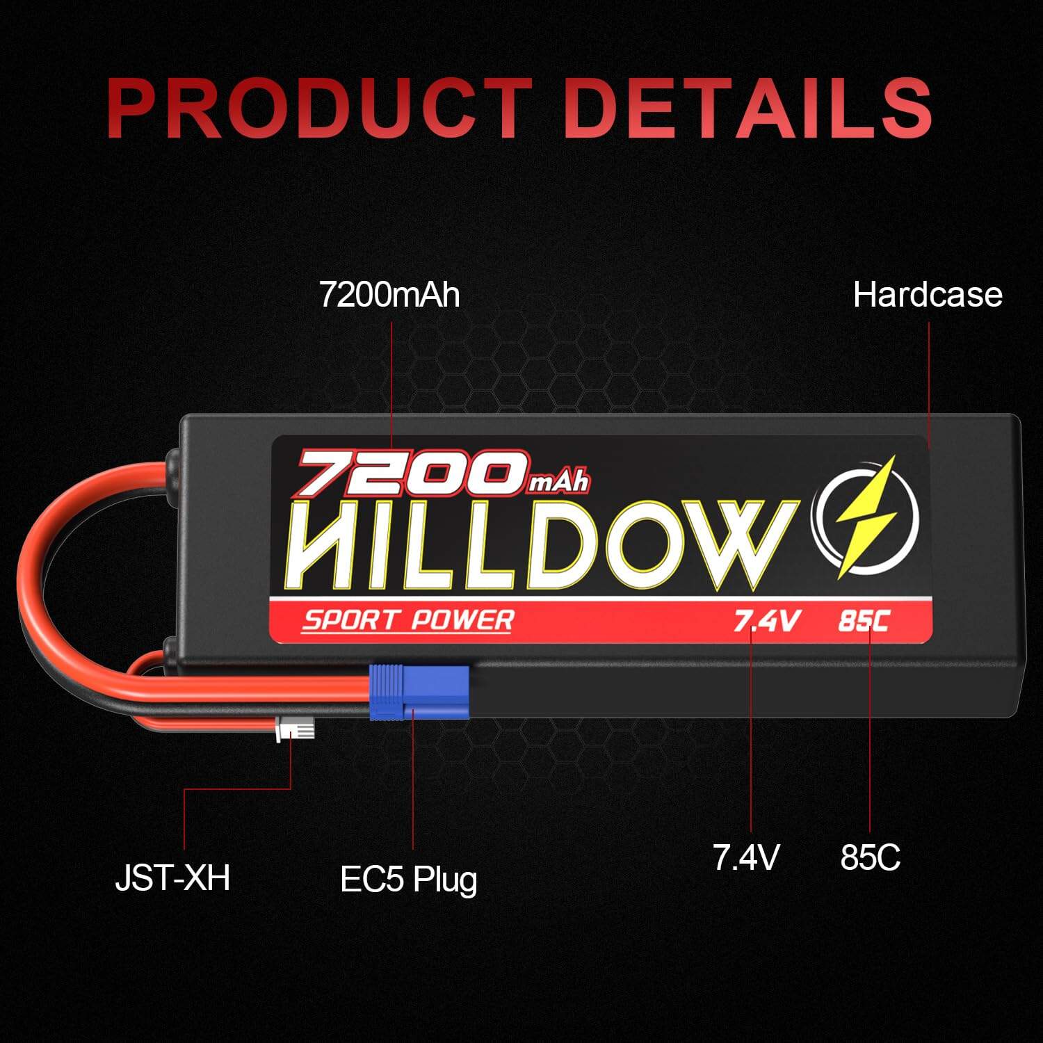Batería de Lipo Hilldow 7.4V 2S 85C 7200mAh Estuche Duro