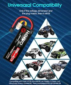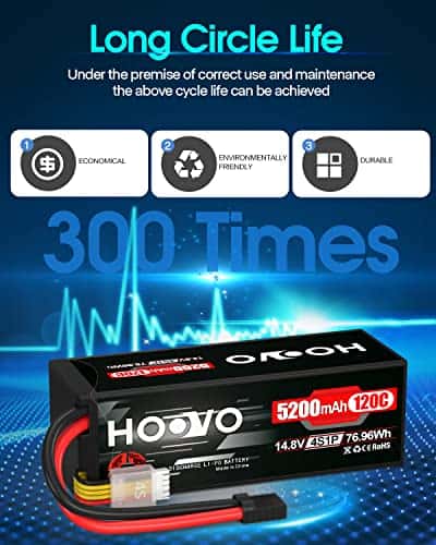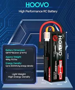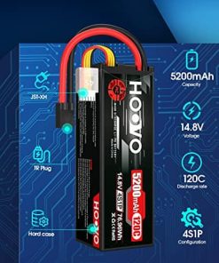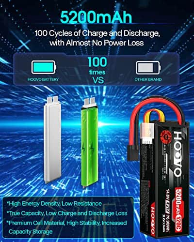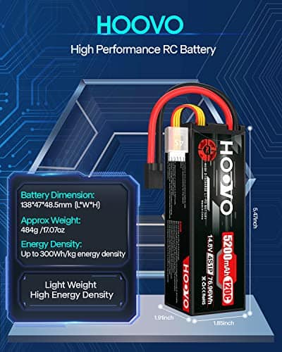 Alto rendimiento – Batería de Lipo HOOVO 4S con estuche duro, alta capacidad, larga vida útil del ciclo (mínimo 150 veces), hasta 200Wh/kg de densidad de energía. Más tiempo de funcionamiento, más diversión. 4S Lipo 5200mAh Especificaciones – Número de celdas: 4; Voltaje: 14.8V; Capacidad: 5200mAh; Descarga: 120C; Conector de descarga: Conector TR. Parámetro – Dimensiones de la batería de Lipo 4S 120C 5200mAh (± 2mm): 138x47x48.5mm / 5.43×1.85×1.91 pulgadas (Largo x Ancho x Alto); Peso aproximado: 484g / 17.07oz (incluyendo cable, conector y estuche). Aplicación – La batería de Lipo HOOVO 14.8V 5200mAh es compatible con la mayoría de los modelos de coches RC en escala 1/10 y 1/8 como: Slash X-mass, Losi, Ofna, Axial, Emaxx, Exceed RC, Tamiya, Redcat Racing, Duratrax, Bandit, Rustler, Jammin’, ElectrixRC, Team Associated SC8, HPI Strada XB 1/10 RTR Buggy Eléctrico, Kyosho GP 4WD RACING TRUCK, etc. Lo que obtienes – Pack de 2 baterías de Lipo HOOVO 4S con conector TR 14.8V 5200mAh 120C en estuche duro con la tecnología de producción más avanzada y equipos estrictos de control de calidad, las baterías de Lipo de HOOVO proporcionan una curva de descarga estable, alta tasa de descarga para alcanzar la máxima velocidad con la mayor estabilidad y potenciar tus hobbies de RC. Para cualquier pregunta sobre el producto, haz clic en «Haz una pregunta» en nuestra tienda virtual o en las opciones de «Tu pedido» haz clic en «contactar al vendedor». Te responderemos dentro de las 24 horas.