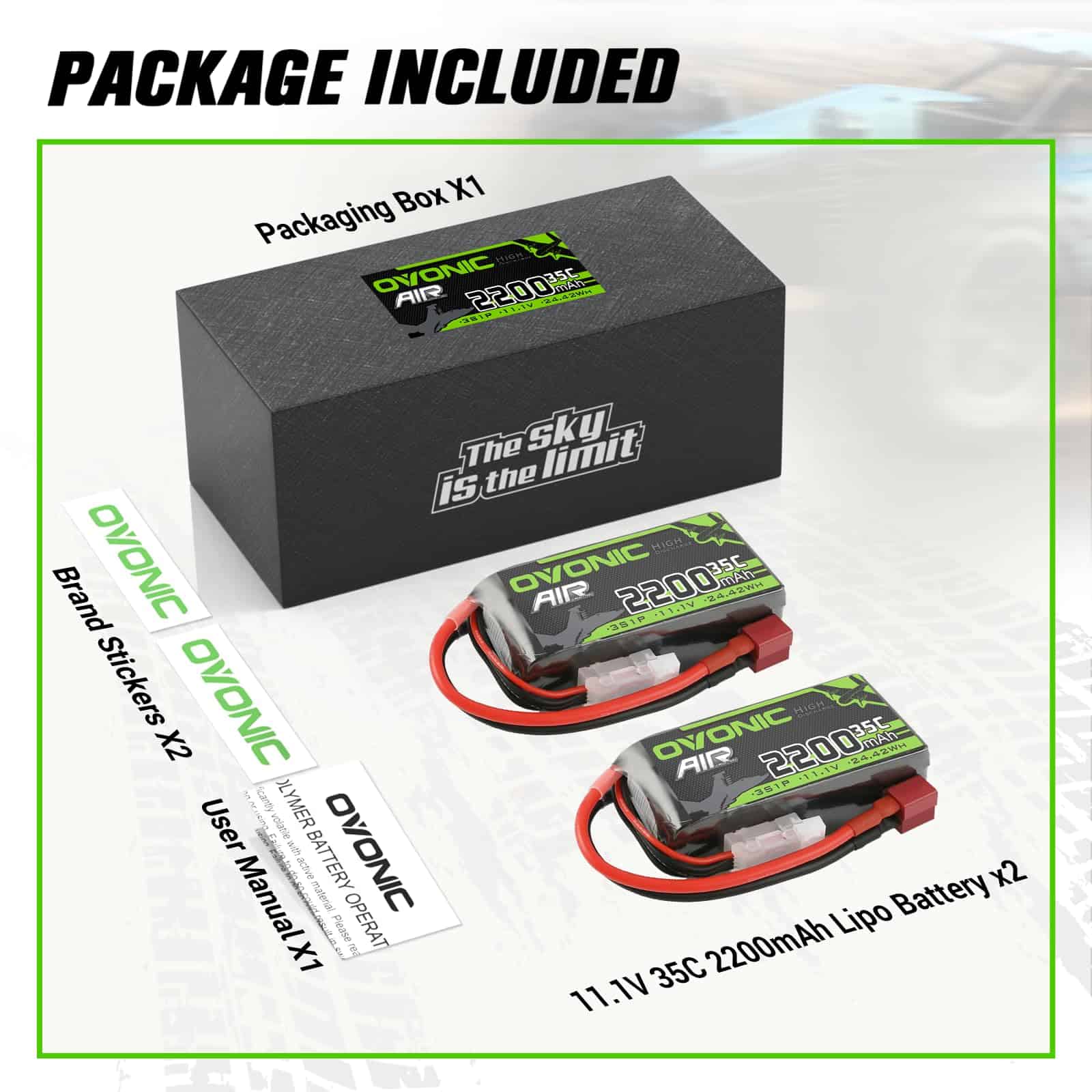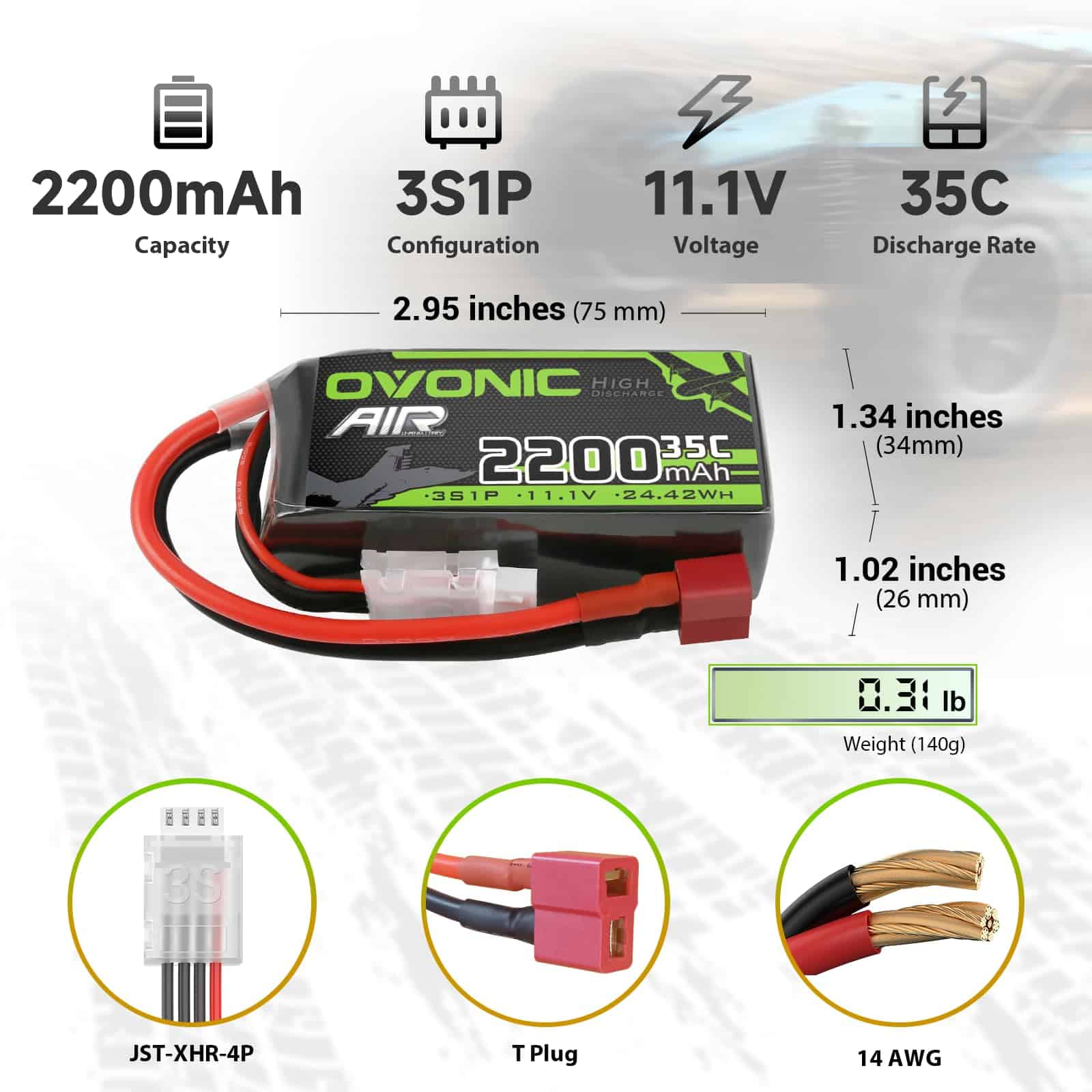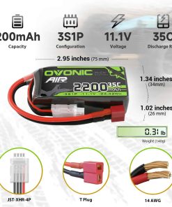 OVONIC Diseño y parámetros de paquete corto – Material: polímero de litio, Voltaje: 11.1V, Celda: 3S, Capacidad: 2200mAh, Descarga: 35C, Enchufe de carga: JST-XHR-4P, Enchufe de descarga: Deans-T, Paquete: Diseño de paquete blando corto. Actualice a los paquetes de baterías lipo OVONIC 3S 2200mAh para una solución de energía de vanguardia que sea amigable con el usuario, respetuosa con el medio ambiente y de última generación, y que brinde una salida confiable y de alto rendimiento para sus necesidades de hobby de RC. Especificación – Batería lipo OVONIC 2200mAh 11.1V Con un voltaje de batería de 11.1V y una configuración 3S1P, estos paquetes de baterías lipo ofrecen una alta tasa de descarga de 35C Máximo a 70C, asegurando una entrega de energía dinámica y estable. Las dimensiones compactas(3mm) de 75 34 26mm/2.95 1.34 1.04pulgadas(L W H) y un peso(5g) de 140g/4.83oz los hacen elegantes, aerodinámicos y adaptables para varias aplicaciones de RC. Priorice un diseño ligero, asegurando un rendimiento de primer nivel sin agregar volumen adicional a sus dispositivos RC. Múltiples Ventajas – Certificación de calidad internacional ISO(más segura), materiales premium(LiCoO2), vida útil del ciclo más larga(350 veces), tiempo de funcionamiento más largo(+12%), tiempo de carga más rápido(-6%), peso más ligero(-5%), Resistencia más baja(-4%). Fuerte Compatibilidad – Compatible con Avión Helicóptero. Para mayor seguridad, utilice el cargador dedicado de OVONIC para cargar su batería. Para obtener más información, busque «OVONIC Mate 1» y «OVONIC X1» en nuestra tienda. Paquete – 2x Batería de Lipo 3S de OVONIC, 2x Pegatinas de marca, Manual del usuario. Por favor, lea el manual del usuario cuidadosamente antes de usar, si tiene algún problema, contáctenos directamente y le responderemos dentro de las 24 horas.