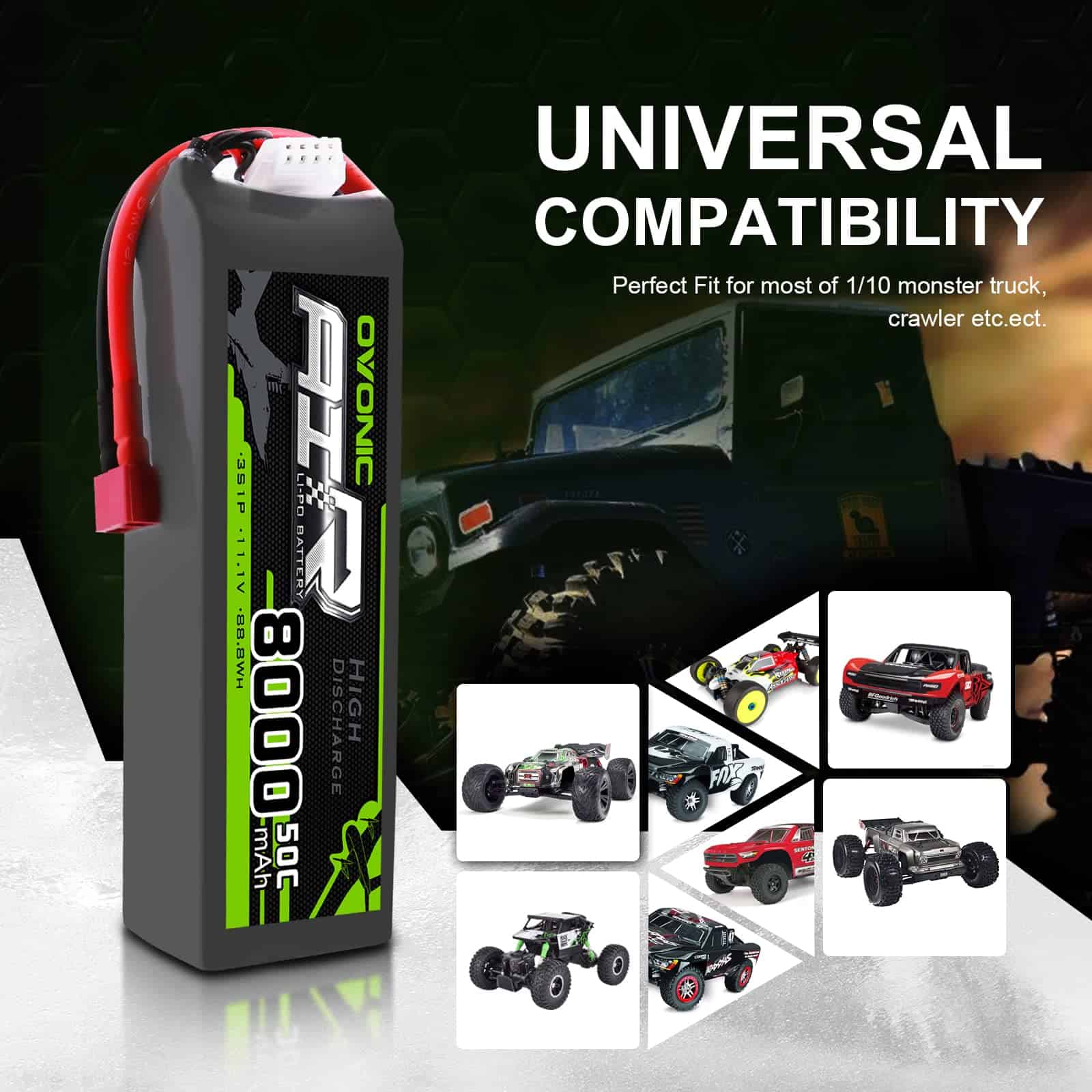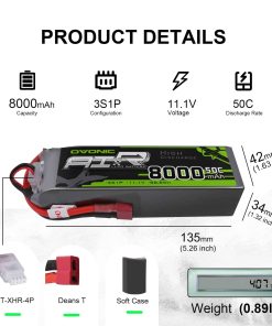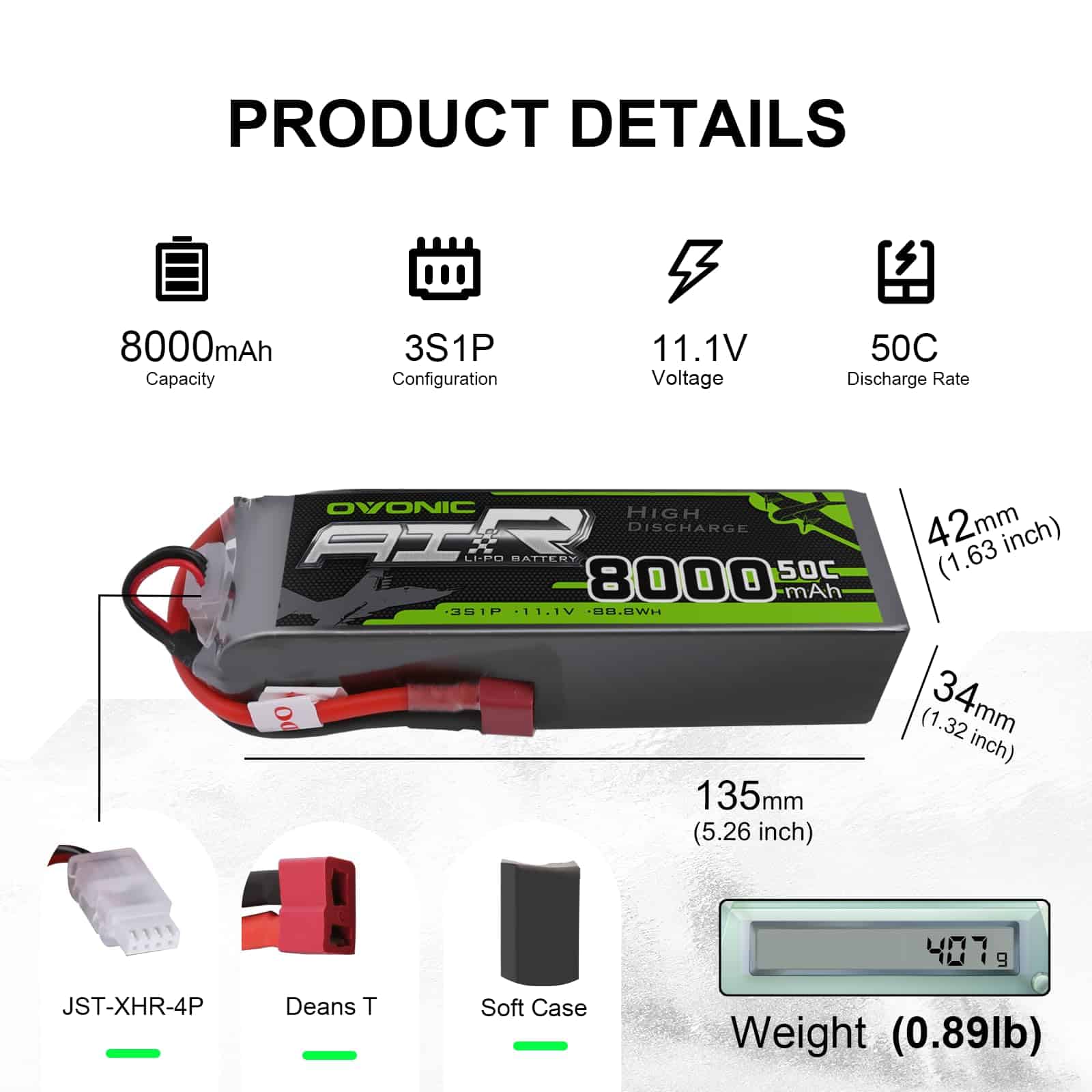 Especificaciones: Número de celdas: 3, Voltaje: 11.1V, Capacidad mínima: 8000mAh, Descarga: 50C, Enchufe de carga: JST-XH-3P, Enchufe de descarga: Conector T, Dimensiones de la batería: 130x40x31mm, Peso de la batería: 424g. Compatible con: Perfecto para todos los vehículos a escala 1/8 que requieren una batería de Lipo 3S. Diseño resistente con carcasa sólida para una máxima durabilidad en automóviles, camiones y buggies. Contenido del paquete: 2x Ovonic 3S 11.1V 8000mAh 50C con Deans Plug LiPo Battery Pack. Nota: Todas las baterías están listas para volar, seleccione el conector correcto según su batería original. Compare las dimensiones con su batería original. Si tiene alguna otra demanda especial o problema, no dude en contactarnos.