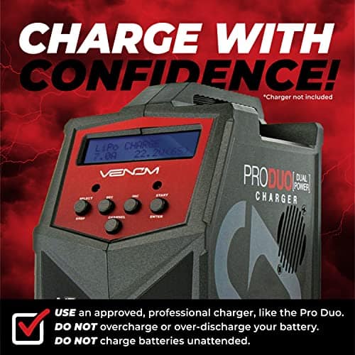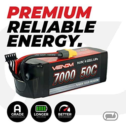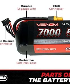 Obtén un rendimiento superior de tu camión, buggy, helicóptero, jet, avión o quad controlado a distancia con esta batería de LiPo de alta capacidad y alta tasa de descarga 50C 4S 7000mAh 14.8V de Venom. Tiene un balanceador de LiPo incorporado y un conector XT60 para asegurar que tus dispositivos de alta potencia estén listos para largas carreras y excursiones deportivas. La batería cuenta con una potente calificación de C de 50C y un sistema de conector universal patentado que viene con un arnés de cableado de silicona flexible suave de calibre 12 pre-soldado que permite una instalación fácil de enchufar y jugar. Se ajusta principalmente a estos modelos de RC: ARRMA Senton BLX, ARRMA Talion 6S BLX, ARRMA Typhon 6S BLX, Associated 1/10 RC10R5 Oval, Associated 1/8 RC8Be Factory Team, Associated 1/8 SC8e Rockstar-Makita, Axial SCX10, Axial SCX10 Jeep Wrangler Unlimited C/R, Axial Yeti XL 1/8 Monster Buggy, Kyosho 1/8 Inferno MP9e, Kyosho 1/8 Inferno VE, Kyosho 1/8 Inferno VE Race Spec, Pro Boat Blackjack 29, Pro Boat Shockwave 26 V3, Traxxas 1/10 Slash, Traxxas 1/10 Slash 4X4, Traxxas Funny Car, Traxxas Spartan, Traxxas Spartan VXL 6S Barco RC. Para brindar la máxima comodidad a tu mente, todos nuestros productos están respaldados por una .