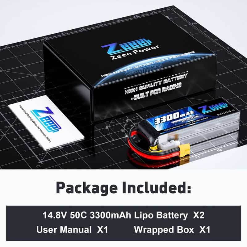 Batería de LiPo Zeee 14.8V 4S 50C 3300mAh con funda suave y conector XT60 para avión RC, helicóptero, barco, drone UAV, coche RC, camión y barco. Esta batería de LiPo tiene un voltaje de 14.8V, una configuración de 4S1P, una capacidad de 3300mAh y una tasa de descarga de 50C con conector XT60. Las dimensiones de la batería son 131 x 43.5 x 29mm y pesa aproximadamente 348g. Es compatible con una amplia gama de vehículos RC, siempre y cuando coincidan el voltaje, las dimensiones y el conector. Se incluyen 2 unidades de la batería de LiPo Zeee 14.8V 50C 3300mAh con conector XT60. Para cualquier problema con el producto, contáctenos a través de la sección ‘Contactar al vendedor’ en ‘Tus pedidos’ o en nuestra tienda. Nos comunicaremos contigo en un plazo de 24 horas.