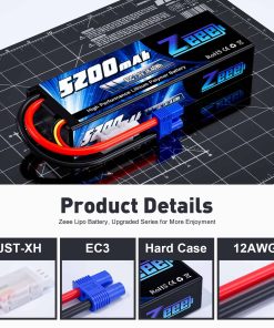 Batería de Lipo Zeee 7.4V 2S 5200mAh 80C en Estuche Rígido con Conector EC3 para Vehículos RC 1/8 1/10 Coche Buggy Truggy Avión Drone (Paquete de 2). Esta batería Zeee 2S Lipo está diseñada con una capacidad de 5200mAh y una descarga de 80C, lo que la hace ideal para su uso en una variedad de vehículos RC. Su tamaño compacto de 138 x 47 x 25mm y peso ligero de 256g la hacen fácil de transportar y manejar durante las carreras. La aplicación de esta batería está especialmente adaptada para coches RC a escala 1/8 y 1/10, como Losi, Slash, HPI Strada XB 1/10 RTR Buggy Eléctrico, Team Associated, Axial, Bandit, y Rustler, entre otros. Para garantizar la seguridad, es importante seguir las instrucciones detalladas en el manual de seguridad, usar un cargador de equilibrio específico para LiPo y no exceder la velocidad de carga recomendada. Con este paquete de 2 baterías Zeee 7.4V 80C 5200mAh 2S, tendrás la potencia necesaria para disfrutar de tu hobby RC al máximo. Contáctanos si tienes algún problema con el producto y te responderemos en un plazo máximo de 24 horas.