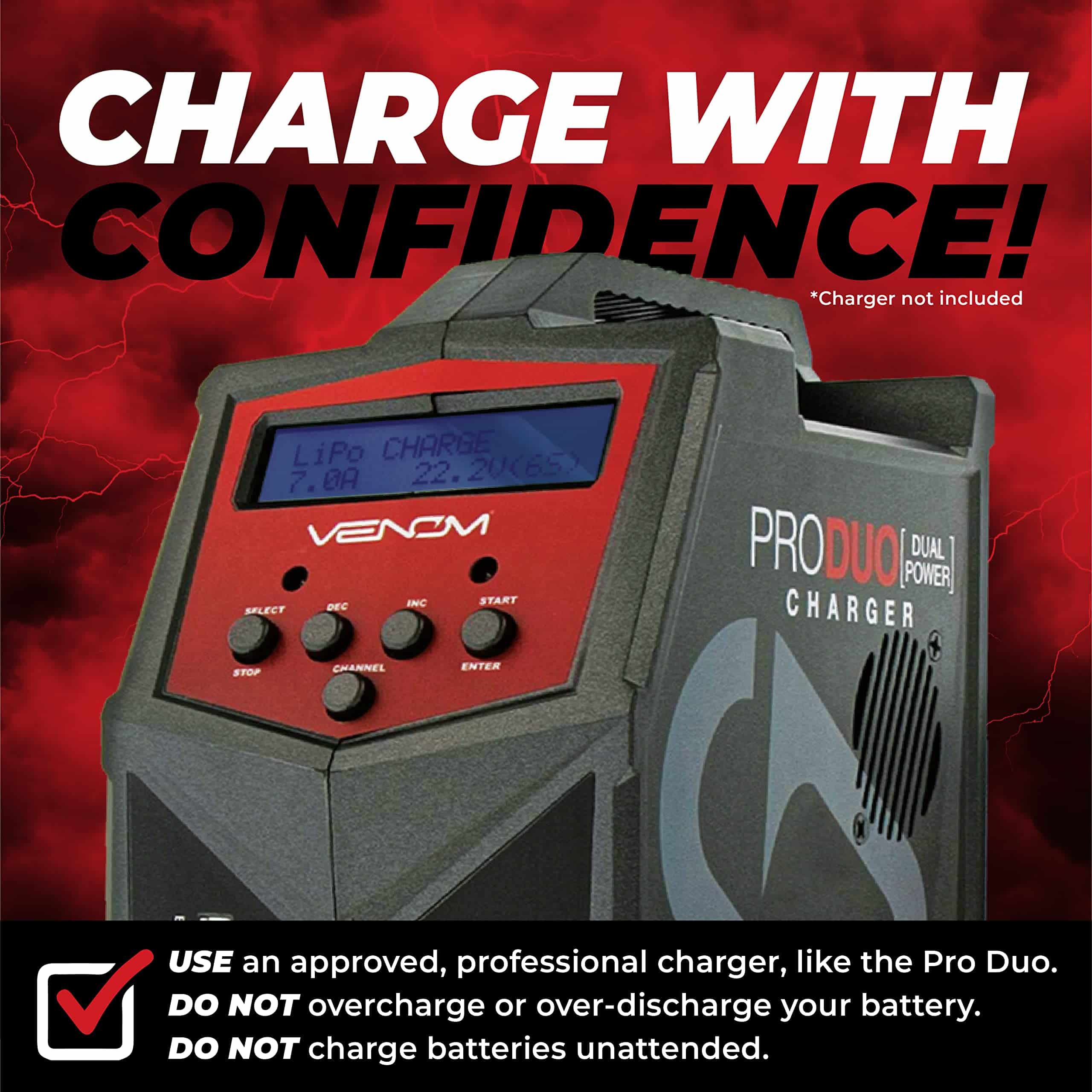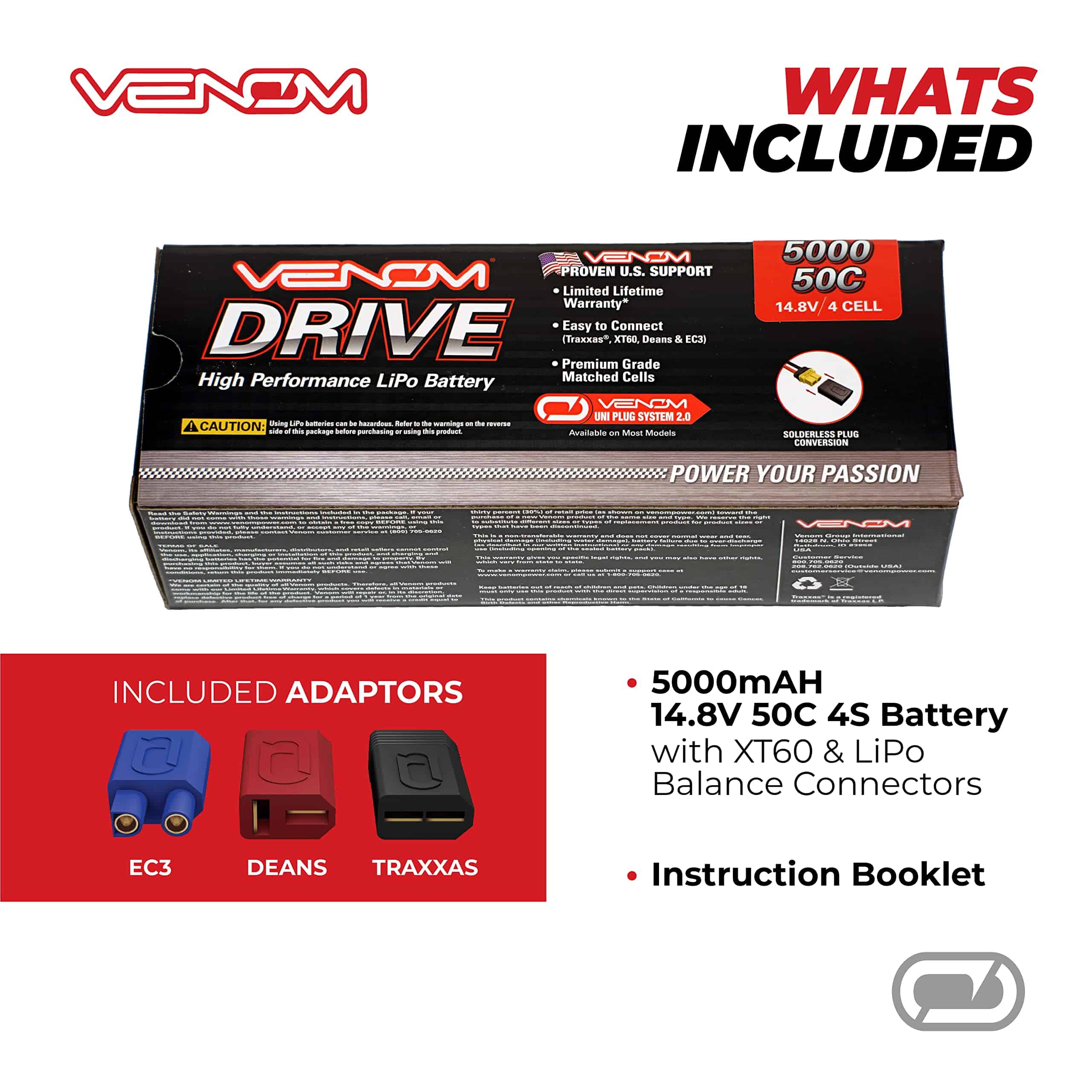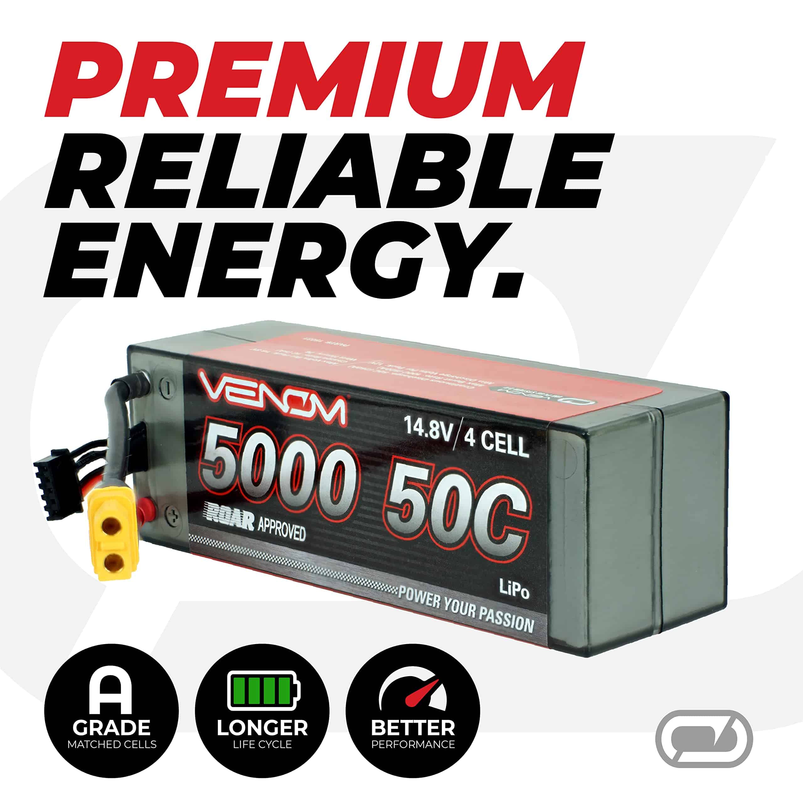 Obtén un rendimiento superior de tu camión, buggy, helicóptero, jet, avión o cuadricóptero controlado a distancia con este paquete de batería de LiPo de gran capacidad y alta tasa de descarga de 50C 4S 5000mAh 14.8V de Venom. Cuenta con un balanceador de LiPo integrado y conector XT60 para asegurar que tus dispositivos de alta potencia estén listos para realizar carreras y excursiones deportivas prolongadas. La batería tiene una clasificación C de 50C y un sistema de adaptadores universales patentado que viene con un arnés de cableado de silicona suave flexible de calibre 12 pre-soldado que permite una instalación fácil de plug & play. Mayormente compatible con estos modelos de RC: ARRMA Sentón BLX, ARRMA Talion 6S BLX, ARRMA Typhon 6S BLX, Associated 1/10 RC10R5 Oval, Associated 1/8 RC8Be Factory Team, Associated 1/8 SC8e Rockstar-Makita, Axial SCX10, Axial SCX10 Jeep Wrangler Unlimited C/R, Axial Yeti XL 1/8 Monster Buggy, Kyosho 1/8 Inferno MP9e, Kyosho 1/8 Inferno VE, Kyosho 1/8 Inferno VE Race Spec, Pro Boat Blackjack 29, Pro Boat Shockwave 26 V3, Traxxas 1/10 Slash, Traxxas 1/10 Slash 4X4, Traxxas Funny Car, Traxxas Spartan, Traxxas Spartan VXL 6S RC Boat. Baterías de competidores comparables: Batería de NiMH Traxxas 8.4V 3000mAh 7 Celdas (2926X), Batería de NiMH Traxxas 8.4V 3300mAh 7 Celdas (2941X). Todos nuestros productos están respaldados con una garantía líder en la industria para proporcionar la máxima comodidad a tu mente.
