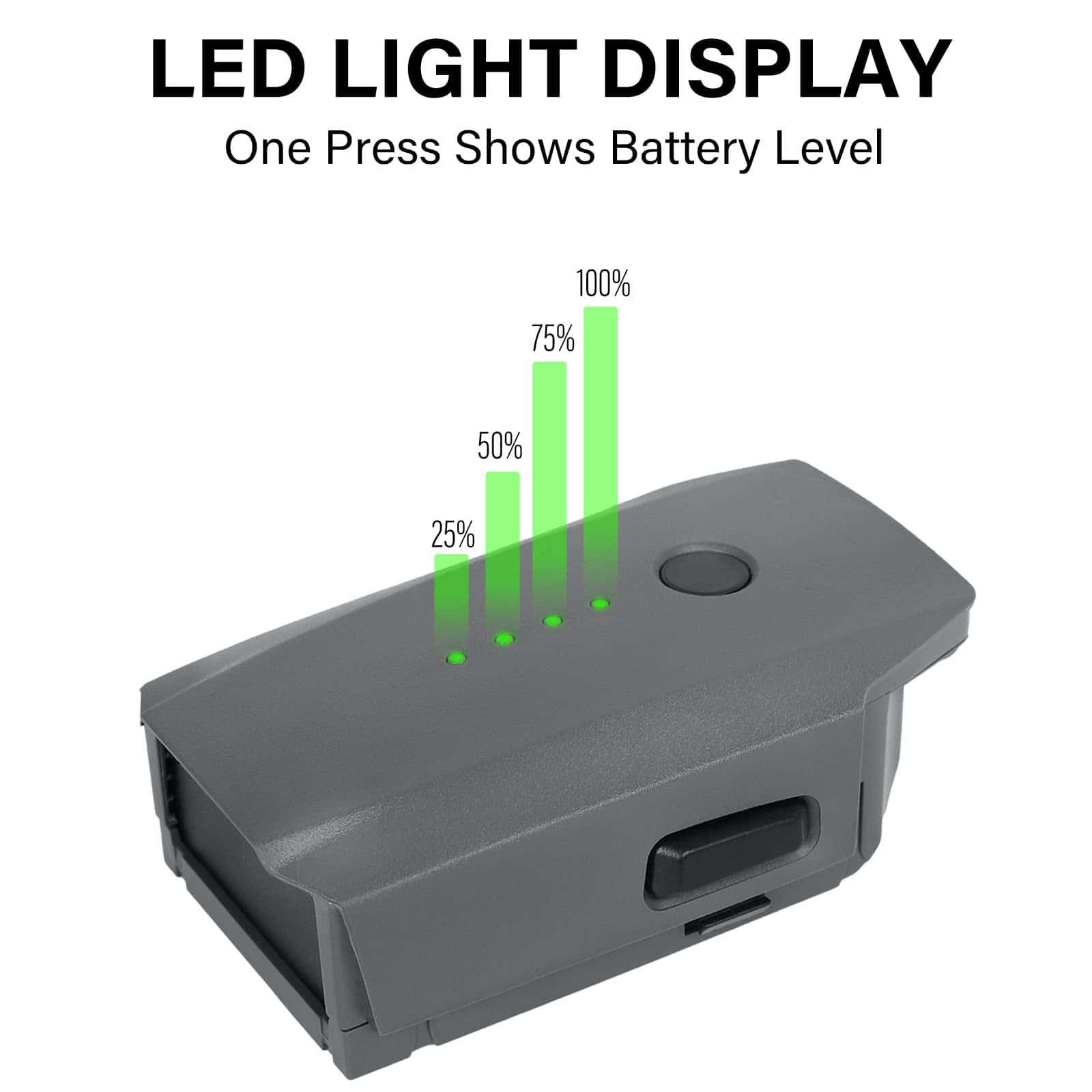 3. CAPACIDAD POTENTE – 3830mAh | Batería de vuelo inteligente Mavic Pro de 11.4V. Cada una completamente cargada puede durar hasta 27 minutos para fotografiar el paisaje espectacular o simplemente la felicidad más simple de la vida. El tiempo real podría variar con otros factores como la altura, el viento, la temperatura, el modelo de vuelo, etc. 4 luces LED integradas muestran la energía en tiempo real con un botón.