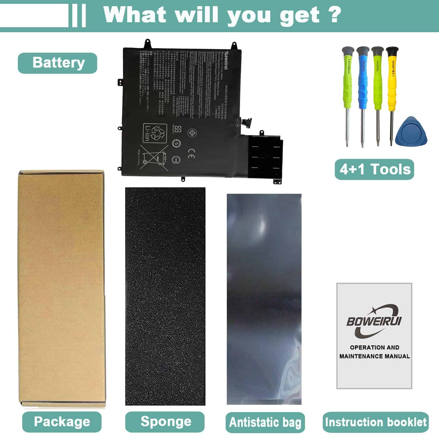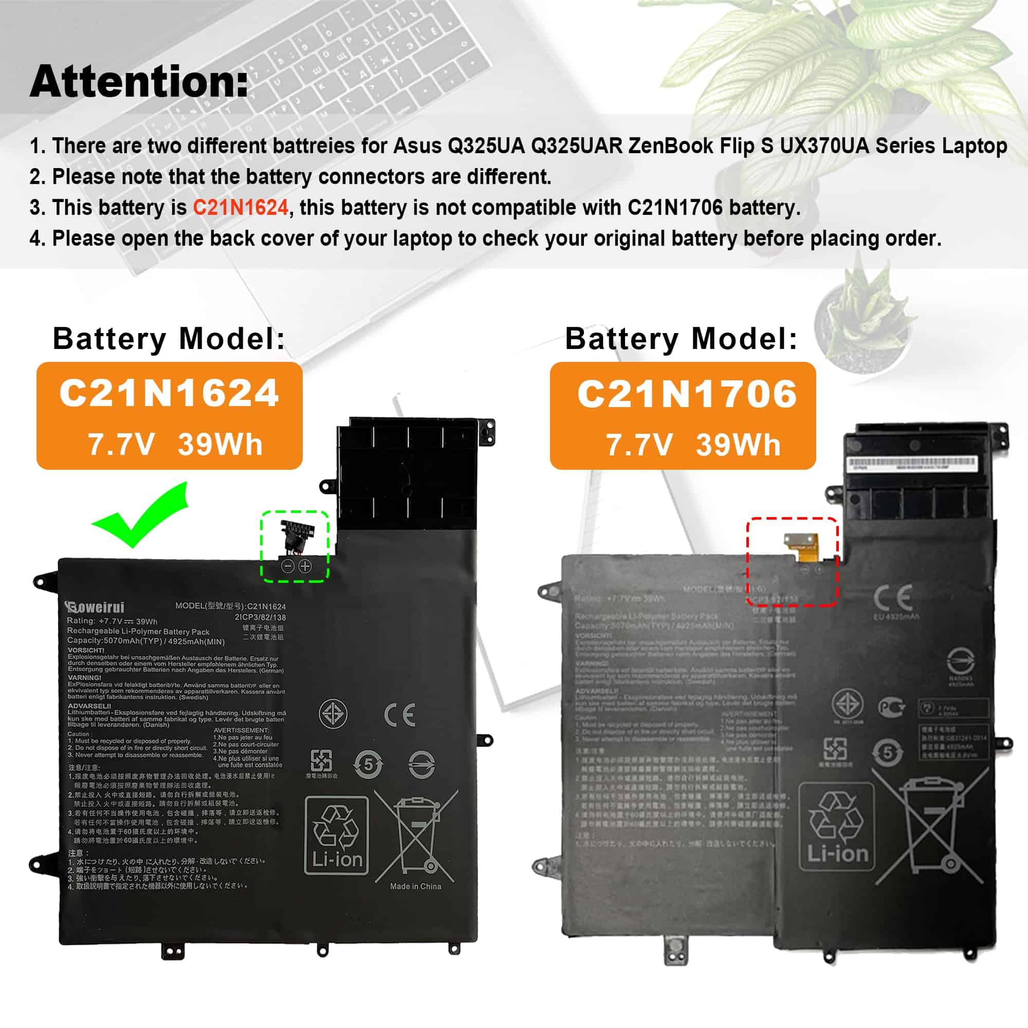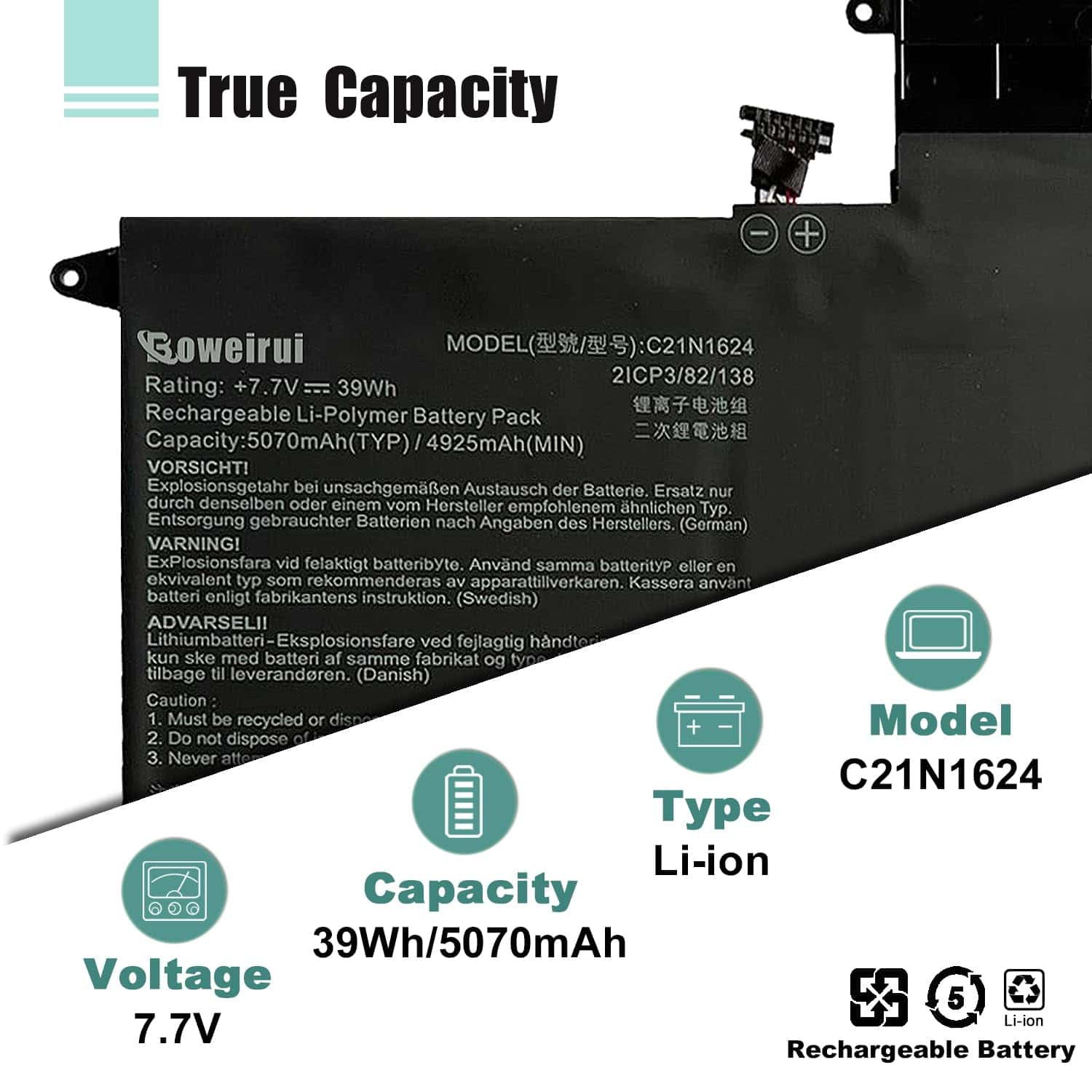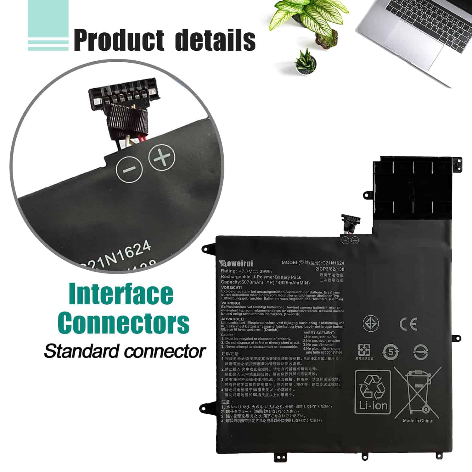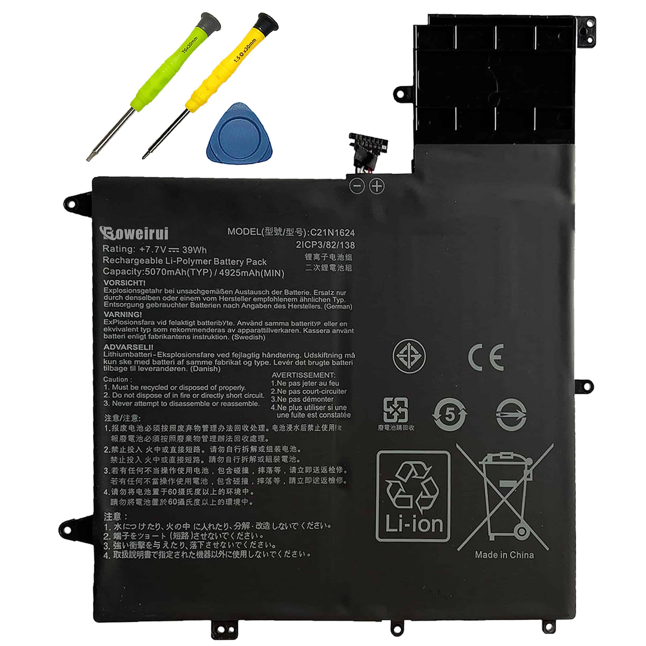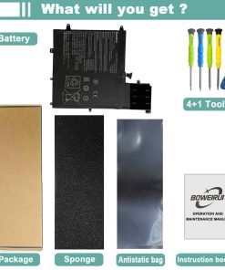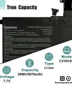 BOWEIRUI ofrece soluciones tecnológicas para el consumidor, incluyendo baterías y adaptadores. Todos nuestros productos son certificados por CE RoHS FCC, garantizando seguridad y larga vida útil. Esta batería de Li-ion recargable tiene una capacidad de 39Wh/5070mAh y voltaje de 7.7V. Viene con una garantía de 12 meses. Reemplaza el modelo C21N1624 y es compatible con varios modelos de Asus ZenBook. Incluye 1 batería C21N1624. Mantén la batería entre 5% y 95% de carga y realiza 3-4 ciclos de carga para un mejor desempeño.