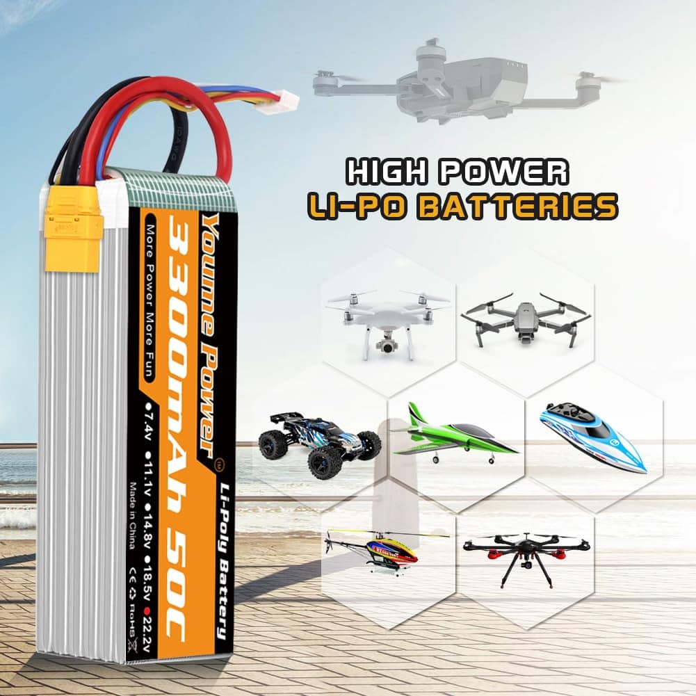 Las baterías LiPo de Youme Power están diseñadas para los exigentes requisitos de las aplicaciones de RC Car, Truck, Airplane, Helicopter, Boat, Drones y FPV.