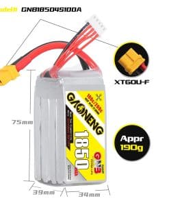 Especificaciones: – Capacidad Mínima: 1850mAh – Configuración: 4S1P/14.8V/4 celdas – Tasa de Descarga Continua: 100C – Tasa de Descarga de Ráfaga Máxima: 200C – Peso Neto: 190g (+/-6g) – Dimensiones: 75mm x 34mm x 39mm (L x A x Al) Aprox.