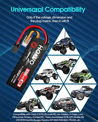 4. Aplicación – Adecuada para coches de radiocontrol 1/8 y 1/10, Losi, HPI Strada XB 1/10 RTR Buggy Eléctrico, Jammin, Redcat Racing, Exceed RC, ElectrixRC, Emaxx, Bandit, Team Associated, Axial, Tamiya, Duratrax, versión Rustler y más. Verifica que el voltaje, dimensiones y conector coincidan para un ajuste perfecto.