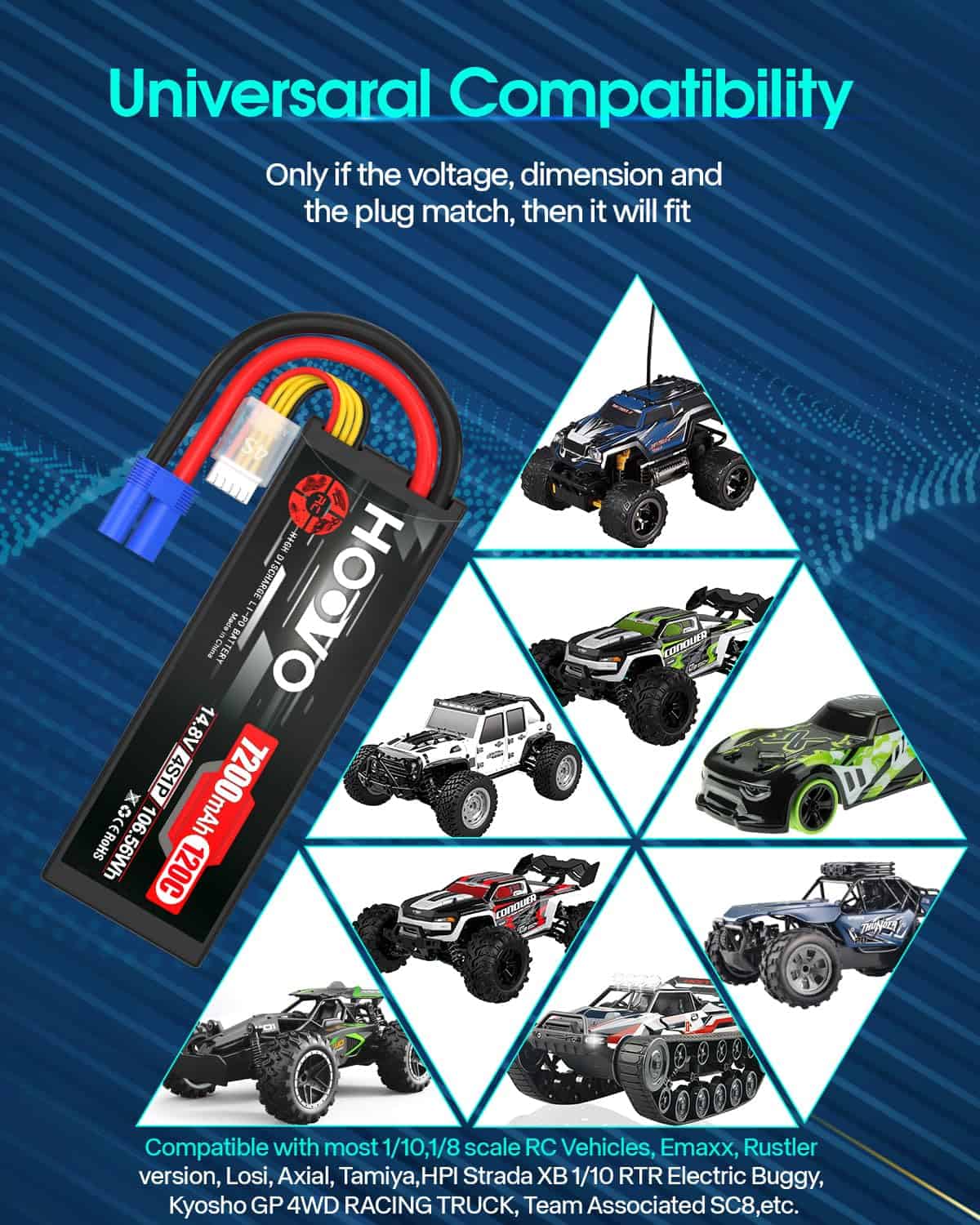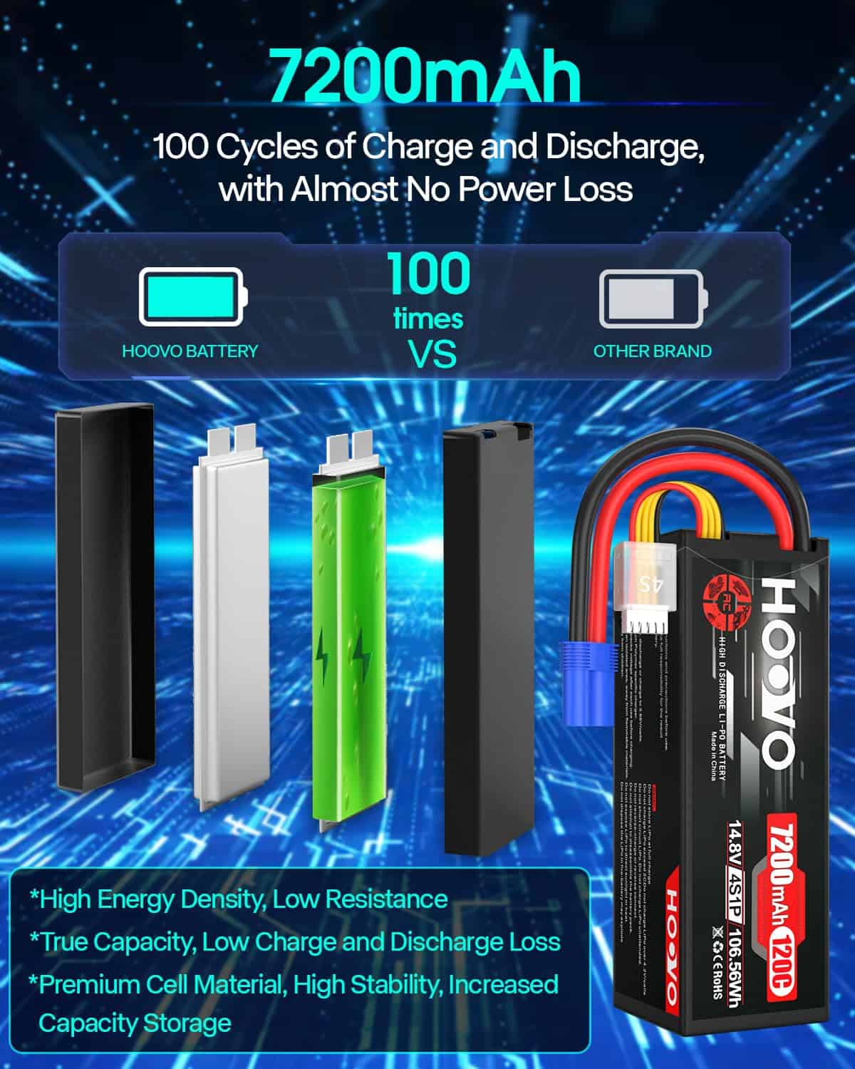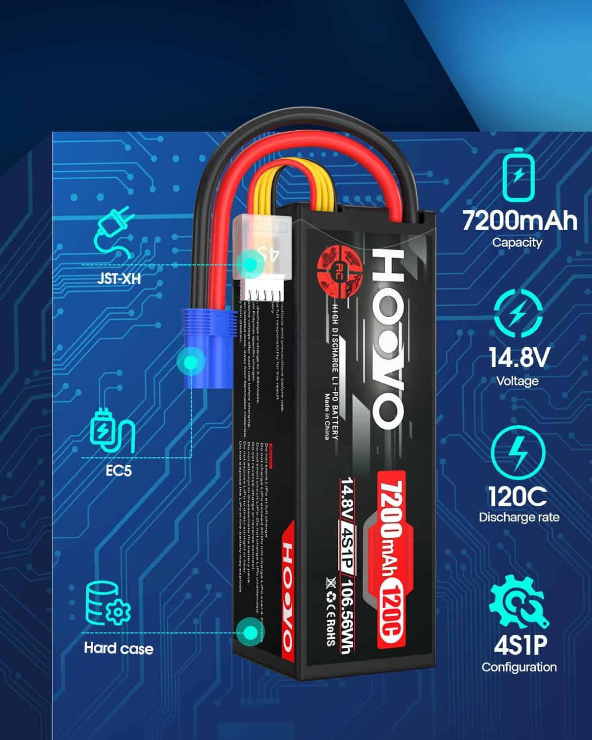 Contenido del Paquete: 2 X Batería LiPo HOOVO 4S 7200mAh 14.8V 120C Estuche Rígido con Conector EC5