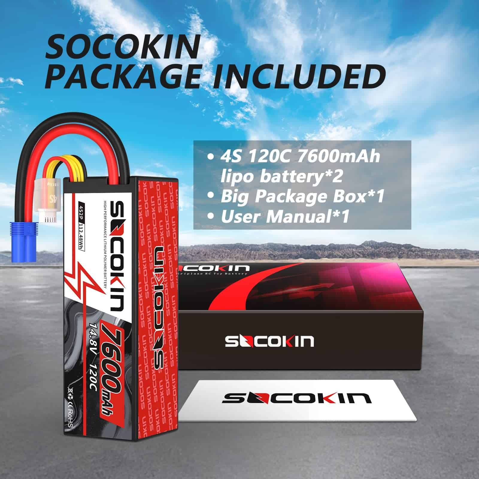 5. Lo que obtienes 2 Baterías Lipo RC Socokin 7600mAh 120C 14.8V con estuche duro. Cualquier problema con la batería, por favor ingresa a TU ORDEN para obtener ayuda o contáctanos a través de nuestro correo de servicio al cliente, responderemos en 24 horas.