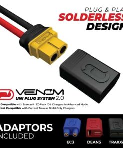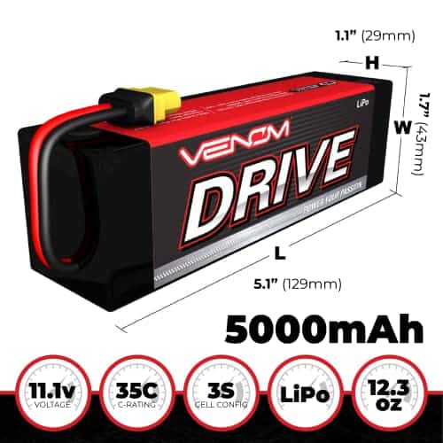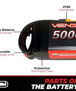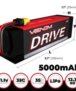 Obtenga un rendimiento superior de su camión, buggy, helicóptero, jet, avión o cuadricóptero controlado a distancia con este paquete de batería de 35C 3S 5000mAh 11.1V LiPo de alto rendimiento de Venom. Cuenta con un Balanceador LiPo incorporado y un conector XT60 para asegurar que sus dispositivos de alta potencia estén listos para extensas carreras y excursiones deportivas. La batería cuenta con una potente tasa de descarga de 35C y un sistema de conector universal patentado que viene pre-soldado con arnés de cableado de silicona suave flexible de calibre 12 que permite una fácil instalación plug & play. Encaja principalmente en estos modelos de RC: ARRMA Senton BLX, ARRMA Talion 6S BLX, ARRMA Typhon 6S BLX, Associated 1/10 RC10R5 Oval, Associated 1/8 RC8Be Factory Team, Associated 1/8 SC8e Rockstar-Makita, Axial SCX10, Axial SCX10 Jeep Wrangler Unlimited C/R, Axial Yeti XL 1/8 Monster Buggy, Kyosho 1/8 Inferno MP9e, Kyosho 1/8 Inferno VE, Kyosho 1/8 Inferno VE Race Spec, Pro Boat Blackjack 29, Pro Boat Shockwave 26 V3, Traxxas 1/10 Slash, Traxxas 1/10 Slash 4X4, Traxxas Funny Car, Traxxas Spartan, Traxxas Spartan VXL 6S RC Boat. Baterías de Competidores Comparables: Batería Traxxas 20C 3S 5000mAh 11.1V LiPo (2831X), Batería Traxxas 25C 3S 5000mAh 11.1V LiPo (2872X). Para brindar la mayor comodidad a su mente, todos nuestros productos están respaldados con un liderazgo en la industria.