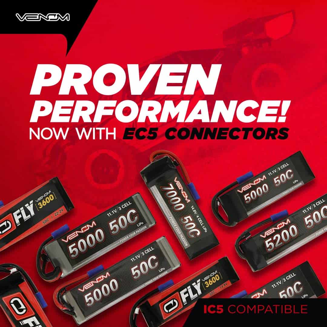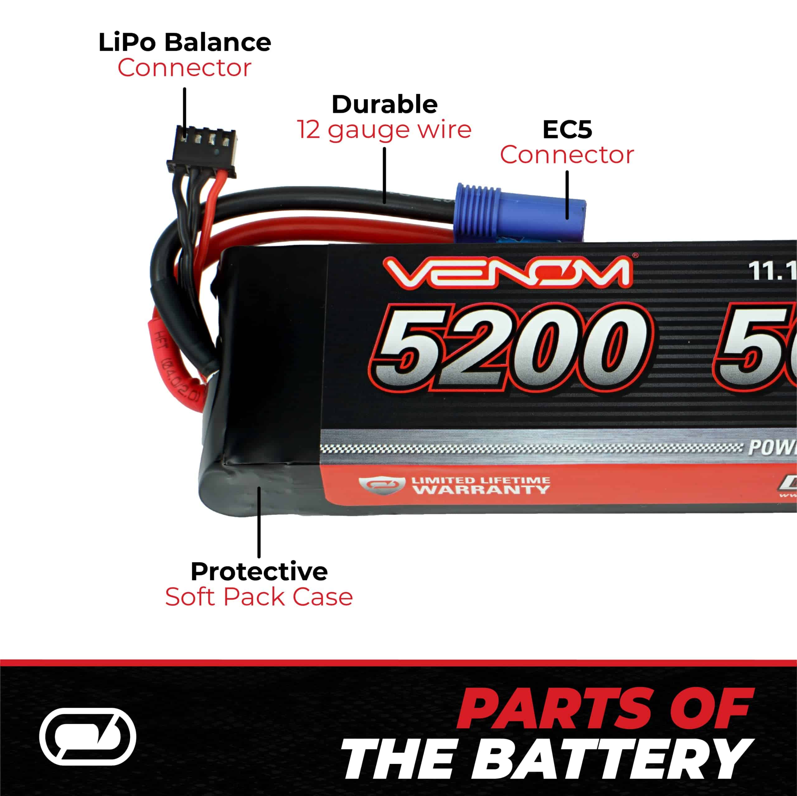 Las baterías LiPo de la serie DRIVE de Venom están diseñadas para satisfacer los exigentes requisitos de las aplicaciones de coches, camiones y barcos RC actuales. Utilizando los últimos avances en tecnología de litio polímero y materiales seleccionados para mejorar el rendimiento, la seguridad y la vida útil: DRIVE proporciona energía premium y fiable para alimentar tu pasión. Esta batería LiPo de 50C 3S 5200mAh 11.1V con conector EC5 es perfecta para la mayoría de las lanchas RC brushless de 1/5 y más pequeñas, coches 2WD y 4WD, monstruos y buggies, y está construida con placas metálicas Venom Flak Jacket para una protección y durabilidad adicionales. Disponible en una amplia gama de tamaños, capacidades y tasas de C, hay una batería VENOM DRIVE para adaptarse a la mayoría de las aplicaciones. Como líder de la industria en baterías y cargadores de RC durante más de una década, Venom es un nombre en el que puedes confiar para la potencia y el rendimiento que exiges. Especificaciones Tipo de batería: Litio Polímero (Batería LiPo) Tasa de C: 50C Voltios: 11.1 Capacidad: 5200mAh Número de celdas: 3S Configuración de celdas: 3S1P Descarga continua: 50C (260A) Tasa de ráfaga máxima: 100C (520A) Voltios máximos por paquete: 12.6V Voltios mínimos por paquete: 9V Tasa de carga: 1C (5.2A) Calibre del cable: Cable de silicona suave y flexible de calibre 12 AWG Tipo de enchufe: EC5 Dimensiones: 155 x 44 x 26 mm / 6.1 x 1.7 x 1 pulgadas Vatios-hora: 57.72 Peso: 10.2 oz (290 g)