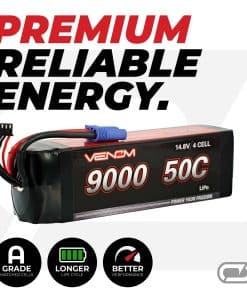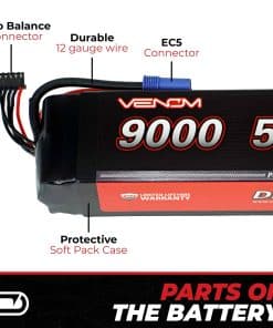Esta batería Venom 50C 4S 9000mAh 14.8V LiPo con enchufe EC5 es perfecta para la mayoría de los barcos RC brushless de escala 1/5 o más pequeños, coches 2WD y 4WD, camiones monstruo y buggies, y está construida con placas metálicas Venom Flak Jacket para una mayor protección y durabilidad.