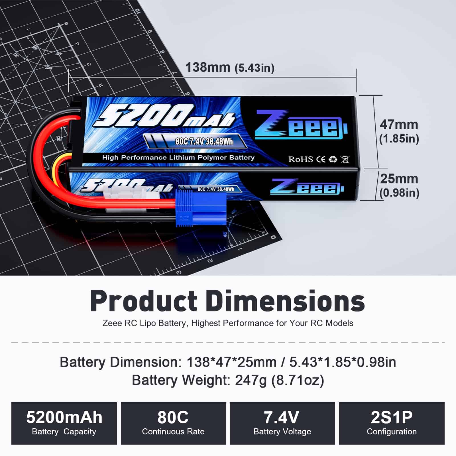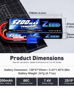 2. Dimensiones de la Lipo Zeee – La dimensión de la lipo Zeee 5200mAh 2S es: 138 47 25mm/5.43 1.85 0.98 pulgadas; Peso Aproximado: 247g/8.71oz.