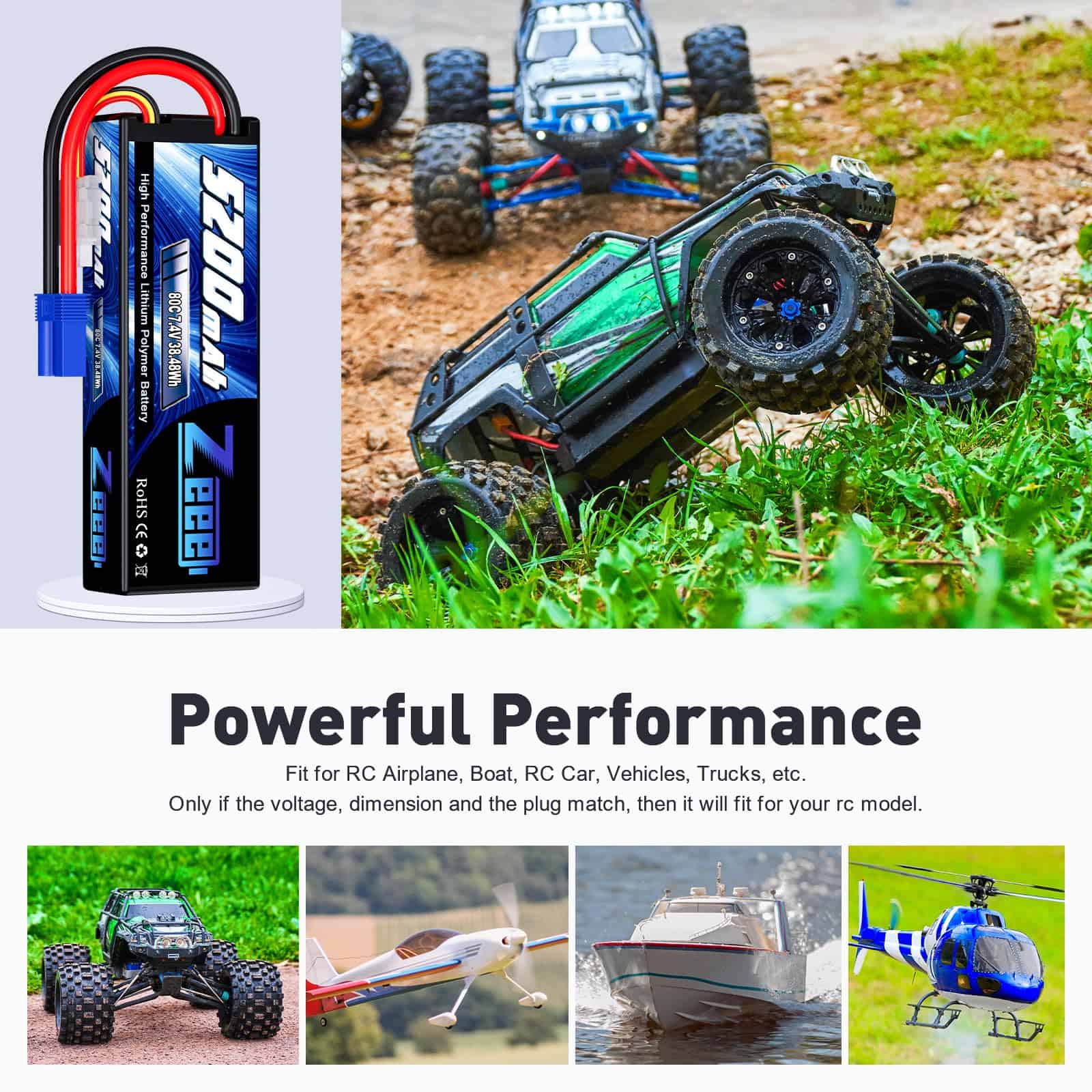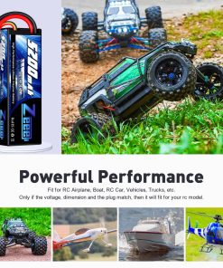 3. Aplicación de la Batería con Carcasa Dura 2S – La batería de Lipo Zeee 2S 5200mAh es compatible con autos rc 1/8 y 1/10, Losi, HPI Strada XB 1/10 RTR Buggy Eléctrico, Team Associated, Axial, Bandit, versión Rustler, etc. (Solo si el voltaje, la dimensión y el conector coinciden, entonces encajará).