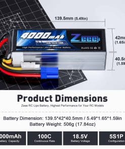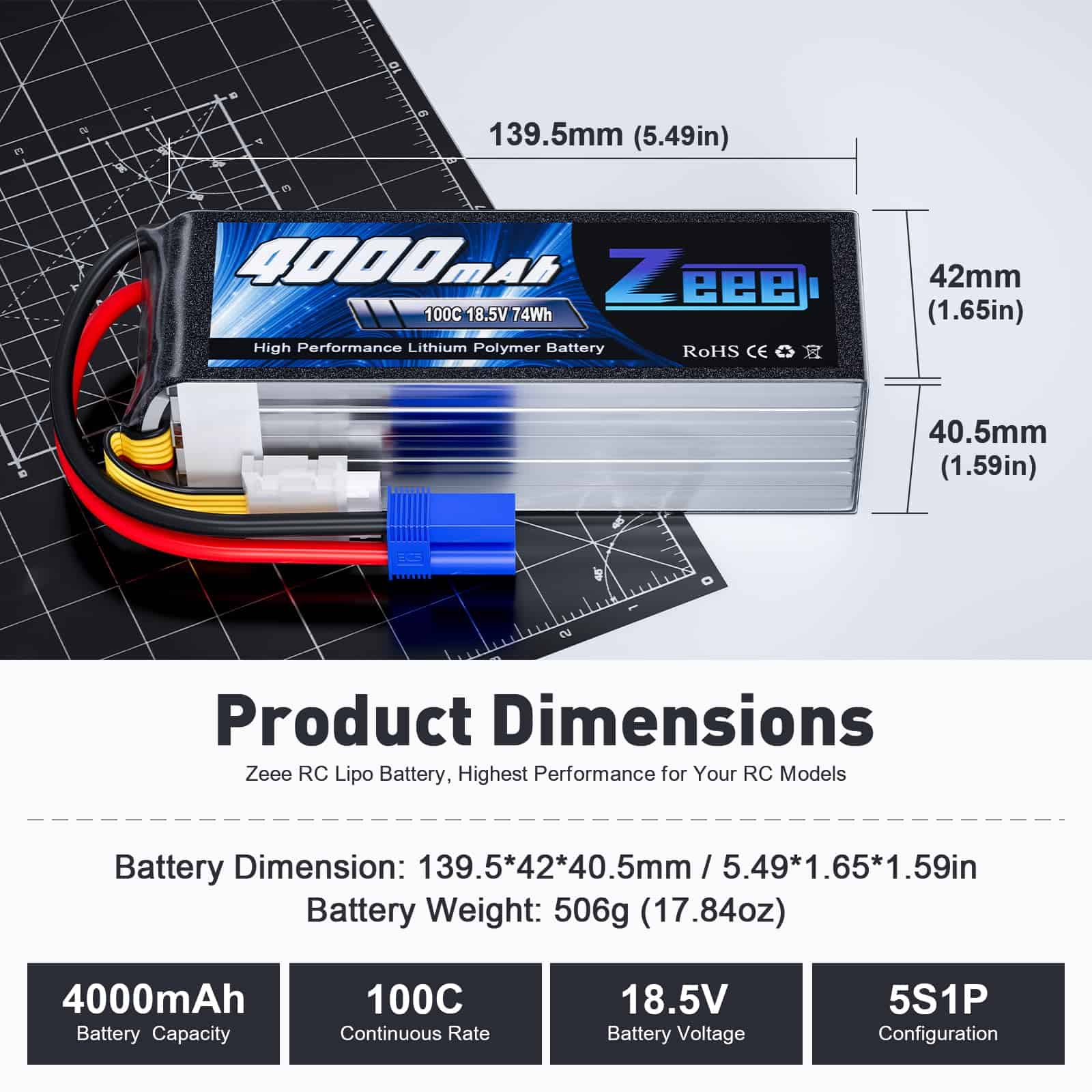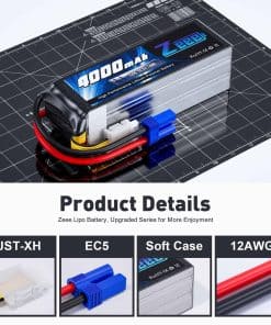 La batería Zeee 5S Lipo de 18.5V 4000mAh es ideal para su uso en una variedad de modelos RC como helicópteros, aviones, barcos, coches y camiones. Esta batería está configurada en 5S1P con una capacidad de 4000mAh y una increíble tasa de descarga de 100C, lo que la hace ideal para aplicaciones de alto rendimiento. El conector tipo EC5 facilita la conexión a diferentes tipos de modelos RC. Es importante seguir las instrucciones de seguridad, como usar un cargador de equilibrio específico para baterías de Litio Polímero (LiPo) y nunca cargar la batería desatendida. Con esta compra, recibirá un paquete de una batería Zeee 18.5V 100C 4000mAh Lipo con Conector EC5, y si tiene algún problema con el producto, puede contactarnos a través de los métodos proporcionados.