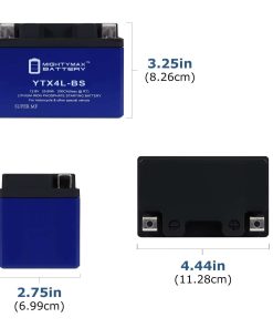 Batería YTX4L-BS 12V 110CCA de Fosfato de Litio. Producto original de Mighty Max Battery. Segura y sin líquido. Se ajusta a todas las cajas de batería que utilizan bloques de espuma. Asegúrese de usar solo un cargador de litio compatible. Los terminales sueltos causarán acumulación de calor y dañarán la batería. Hasta un 80 por ciento más ligera y 5 veces la vida útil de una equivalente de ácido de plomo con más de 2000 ciclos profundos al 80 por ciento de profundidad de descarga. Respaldado por una garantía completa de 1 año.
