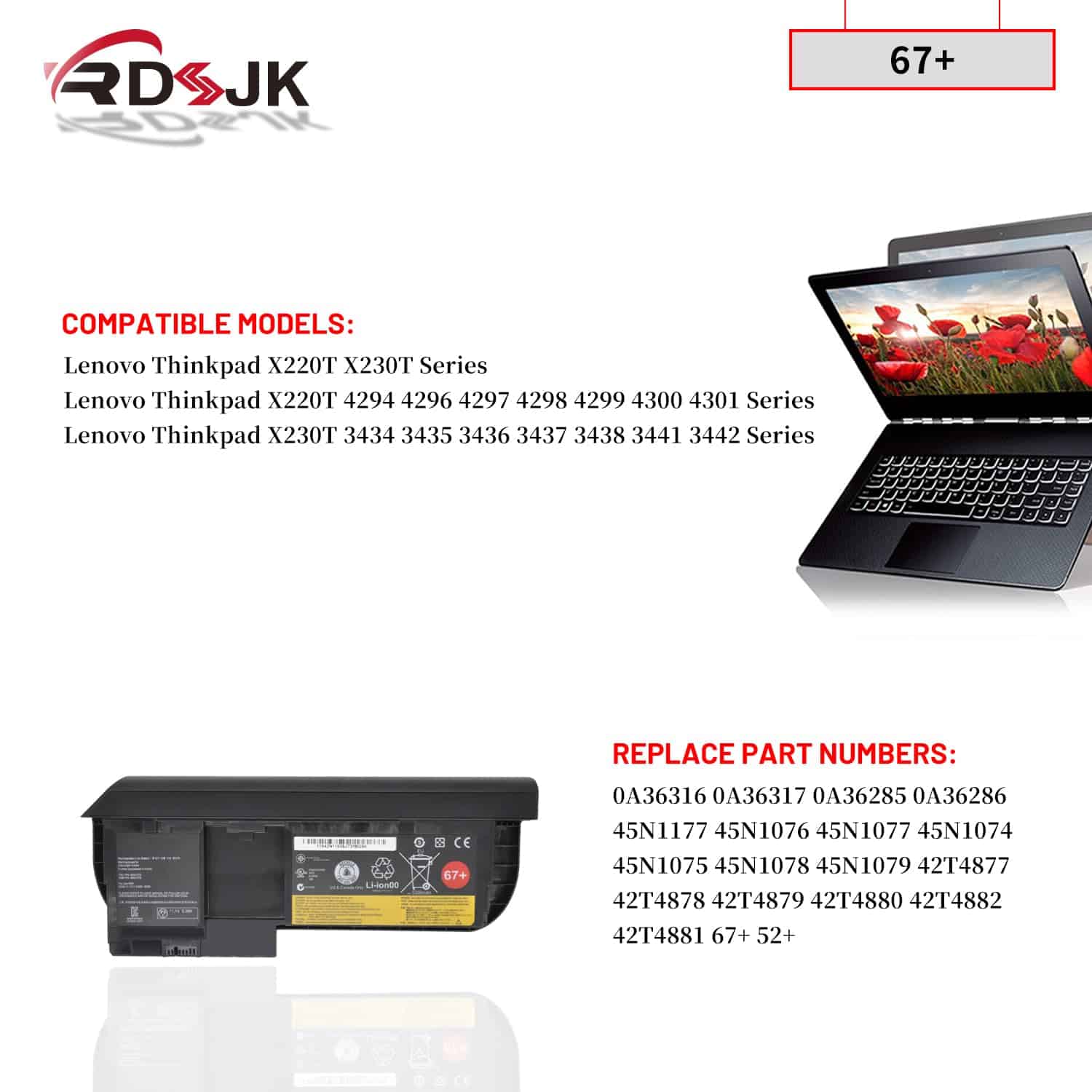 Tipo de Batería: Li-ion; Voltaje: 11.1V; Capacidad: 63Wh; Color: NegroModelos de Máquinas Compatibles:Compatible con Lenovo Thinkpad X220T X230T Series Tablet/LaptopCompatible con Lenovo Thinkpad X220T 4294 4296 4297 4298 4299 4300 4301 SeriesCompatible con Lenovo Thinkpad X230T 3434 3435 3436 3437 3438 3441 3442 SeriesNúmeros de Parte Compatibles:0A36316 0A36317 0A36285 0A36286 45N1177 45N1076 45N1077 45N1074 45N1075 45N1078 45N1079 42T4877 42T4878 42T4879 42T4880 42T4882 42T4881 67+ 52+Nota:No es compatible con X220 X230, es X220 Tablet X230 Tablet.