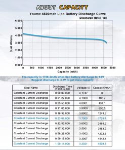 Batería de 6S Lipo Youme: Marca: Youme, Material: polímero de litio, Capacidad: 4500mAh, Celdas: 6s, Tasa de Descarga: 60C, Conector de Carga: JST-XH, Conector de Descarga: EC5, Cable de Silicona: 10awg, Tasa de Carga Sugerida: 0.5C-1C, Cargador Sugerido: balanceador, Dimensión: 136 45 56mm, Peso: 580g, Lista de Empaque: 2pcs x Batería 6S 22.2v LiPo 4500mAh 60C con Conector EC5, Destacados del Producto: 1. Alto Rendimiento, 2. Durabilidad, 3. Compatibilidad, 4. Carga Rápida, 5. Pack de Valor, Ideal para: Carreras de Autos RC, Off-Roading de Camiones RC, Tanques RC, Acrobacias de Aviones RC, Fotografía Aérea con Drones, Carreras de Barcos, Mejore su experiencia RC con la Batería Youme 6S Lipo 22.2V 4500mAh 50C RC Battery.