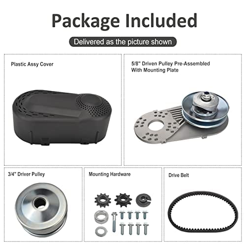 Descripción: ¡Totalmente nuevo, nunca usado! PIEZAS DE REPUESTO DE CALIDAD SUPERIOR OEM. Se adapta al Kit de Convertidor de Par de 3/4″ Predator (Harbor Freight) para Go Karts Se incluye 1 piñón 1 x Piñón de 12 dientes para cadena 35 1 x Piñón de 10 dientes para cadena 40/41 Este kit viene con un embrague conducido de 6″. Se adapta a todos los motores con un cigüeñal recto de 3/4″ de pulgada. Reemplaza a Comet También se adapta a los Go Karts de Manco Este kit funcionará en motores de hasta 11 caballos de fuerza. No aceptamos responsabilidad por cualquier kit dañado instalado en motores de mayor potencia. Se recomienda una instalación profesional. No se incluyen instrucciones. El paquete incluye: 1X Correa de transmisión 1X Cubierta de plástico 1X Polea motriz de 3/4″ 1X Polea conducida de 5/8″ 1X Placa de soporte de aluminio 1X Piñón de 12 dientes 35 1X Piñón de 10 dientes 420/40/41 (ya instalado) 1X Kit completo de herrajes de montaje Como se muestra en la imagen. Compatibilidad: Se adapta a todos los motores con un cigüeñal recto de 3/4 de pulgada