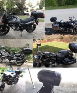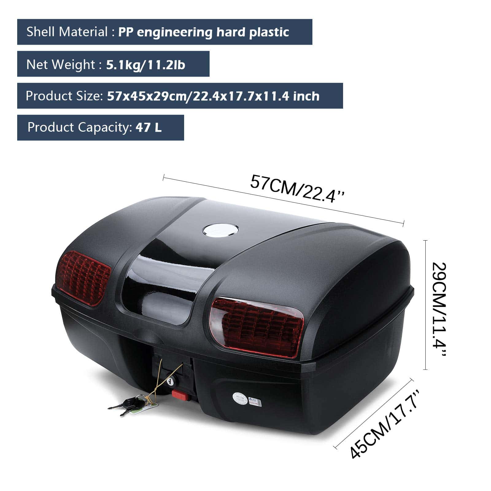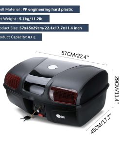 Baúl de motocicleta universal para la parte trasera, ideal para motocicletas y vehículos todoterreno. Fácil de instalar con herrajes de montaje incluidos. Puede ser rápidamente removido cuando está desbloqueado e incluye 2 llaves de seguridad. Incorpora una correa cruzada para fijar el casco u otros objetos dentro del baúl y evitar que se balanceen. Perfecto para almacenar cascos, guantes, ropa y accesorios. Capacidad para un casco integral o dos cascos abiertos. Muy conveniente de llevar a cualquier lugar que desees. Material resistente a impactos, arañazos y al agua. Con placa base de acero pesado que le proporciona rigidez. Tamaño del producto: 575mm x 455mm x 305mm. Capacidad de 47 litros, peso neto de 11.2 libras. Asegúrate de tener un portaequipajes para montar este baúl en tu motocicleta. Incluye: 1x Baúl de Moto, 2x Llaves de seguridad (material de montaje incluido) 1x Instrucciones de instalación.