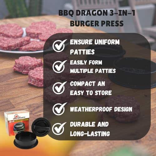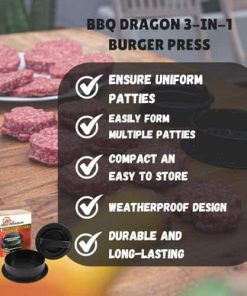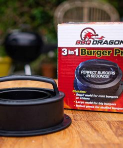 ¡Haz de la parrillada o de cocinar en casa una experiencia placentera y sin complicaciones con la prensa para hamburguesas 3 en 1 de BBQ Dragon! ¡Ordénalo ahora y disfruta de hamburguesas perfectas cada vez!