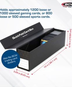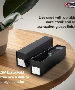 Fabricadas con cartulina duradera recubierta con papel brillante impreso, las BCW QuickFolds para Tarjetas con Fundas son atractivas cajas de almacenamiento de tarjetas premium. Las cajas se envían planas para un fácil almacenamiento y un envío económico. La tapa se cierra de forma segura mediante dos pares de imanes fuertes, manteniendo tus tarjetas seguras. Las tarjetas se almacenan verticalmente para la mejor presentación de la mayoría de las tarjetas deportivas y de juego. Uno de los extremos de la caja tiene un panel de identificación para que puedas etiquetar qué tarjetas están incluidas. El sistema de plegado fácil permite que los paneles planos iniciales se plieguen en una caja en un proceso sencillo. Solo retira el adhesivo antes de doblar la caja. Luego pliega la caja y presiona los paneles donde se encuentran las capas adhesivas. Esta caja QuickFold tiene una longitud de 15 pulgadas, lo suficientemente grande para almacenar aproximadamente 800 tarjetas deportivas sueltas, o 1200 tarjetas de juego sueltas, dependiendo del grosor exacto de tus tarjetas. El ancho y la altura de la caja QuickFold son lo suficientemente grandes como para acomodar tarjetas con funda. Los Separadores de Tarjetas BCW Altos también cabrán debajo de la tapa. El BCW QuickFold para Tarjetas con Fundas es una caja de lujo para una protección ultra de tarjetas de béisbol, fútbol, fútbol, baloncesto, hockey y otras tarjetas deportivas. Estas BCW QuickFolds también son excelentes para almacenar cartas de juego como Magic the Gathering (MTG), Pokemon y otros TCG.