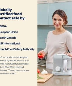 La seguridad es una prioridad con Babycook, ya que cuenta con un diseño de bloqueo para garantizar que todos los componentes estén correctamente ensamblados antes de iniciar la cocción. El tazón de Tritan es seguro para el contacto con alimentos a altas temperaturas y cumple con los estándares de seguridad más exigentes en todo el mundo. Certificado por diversas autoridades internacionales, puedes tener la total tranquilidad al preparar alimentos para ti y tu familia con este excepcional procesador de alimentos para bebés.