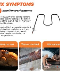 El elemento de calentamiento del horno Frigidaire 316203200 está hecho de una aleación de acero inoxidable de níquel resistente a altas temperaturas, que se utiliza para tener buena resistencia y resistencia a la oxidación a altas temperaturas continuas. Este material se puede utilizar durante mucho tiempo. Probado por el fabricante, larga vida útil. Si ocurren las siguientes condiciones, reemplace el elemento calefactor a tiempo: Poca o ninguna calefacción al hornear, No calentará, Desgastado o corroído. >>>NOTA: Si su elemento no se ilumina o calienta correctamente, significa que lo más probable es que el control o la energía principal no esté entre 220 y 240V.