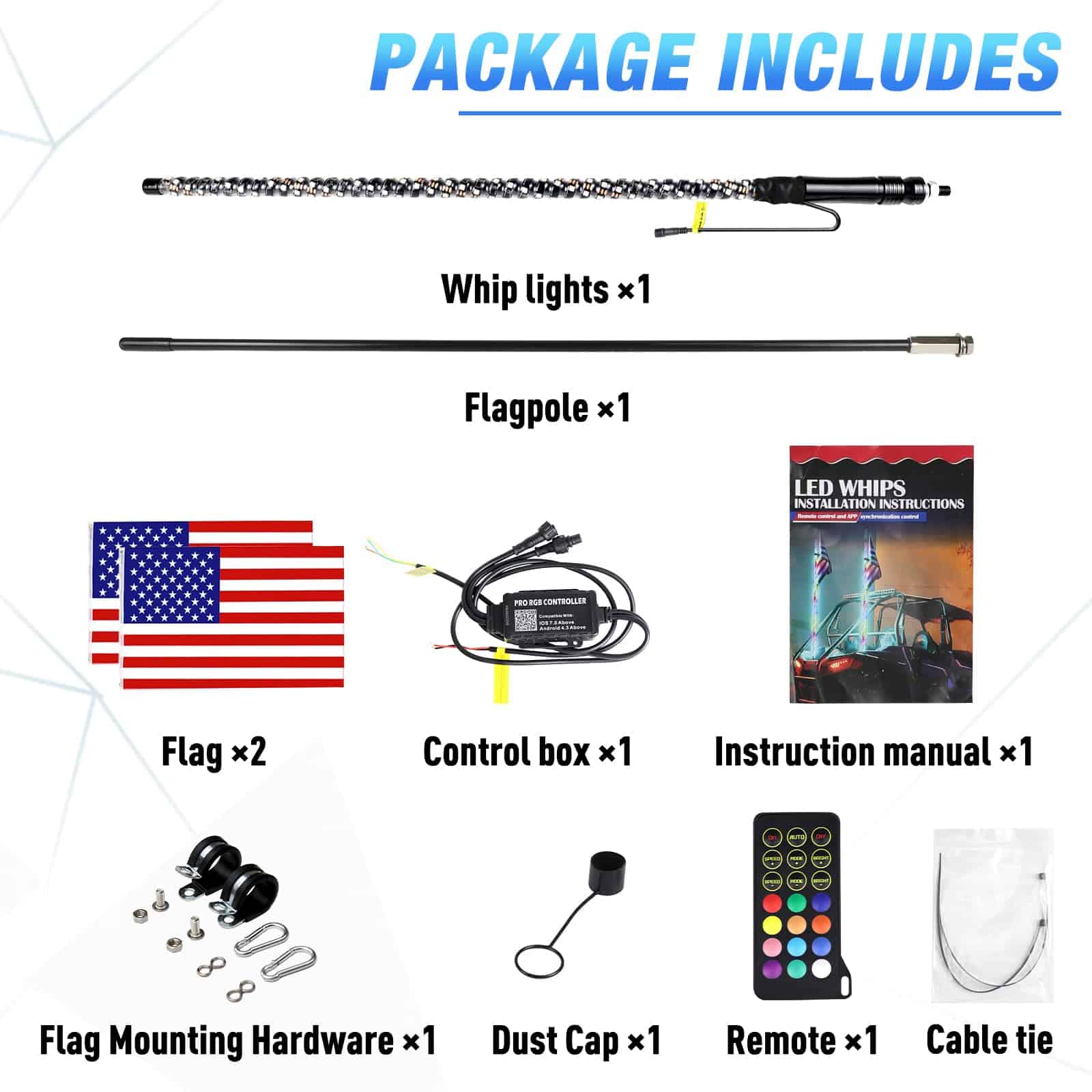 3. Látigo Extra Las luces de látigo vienen con un asta de bandera adicional y una combinación de bandera. Puede girar con las luces de látigo, y el asta de bandera se instala durante el día para advertir a los vehículos/peatones.