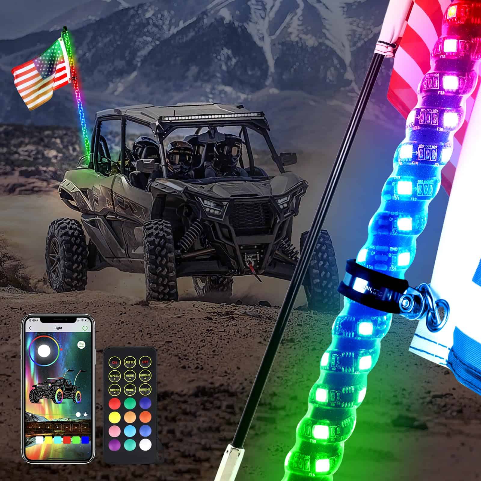 4. Durabilidad Las luces de látigo ATV están hechas de resina flexible resistente, que se puede doblar a 180 y no se romperá fácilmente. Con material impermeable IP67, a prueba de agua, polvo y arena, puedes conducir con confianza en terrenos difíciles o en condiciones climáticas extremas.