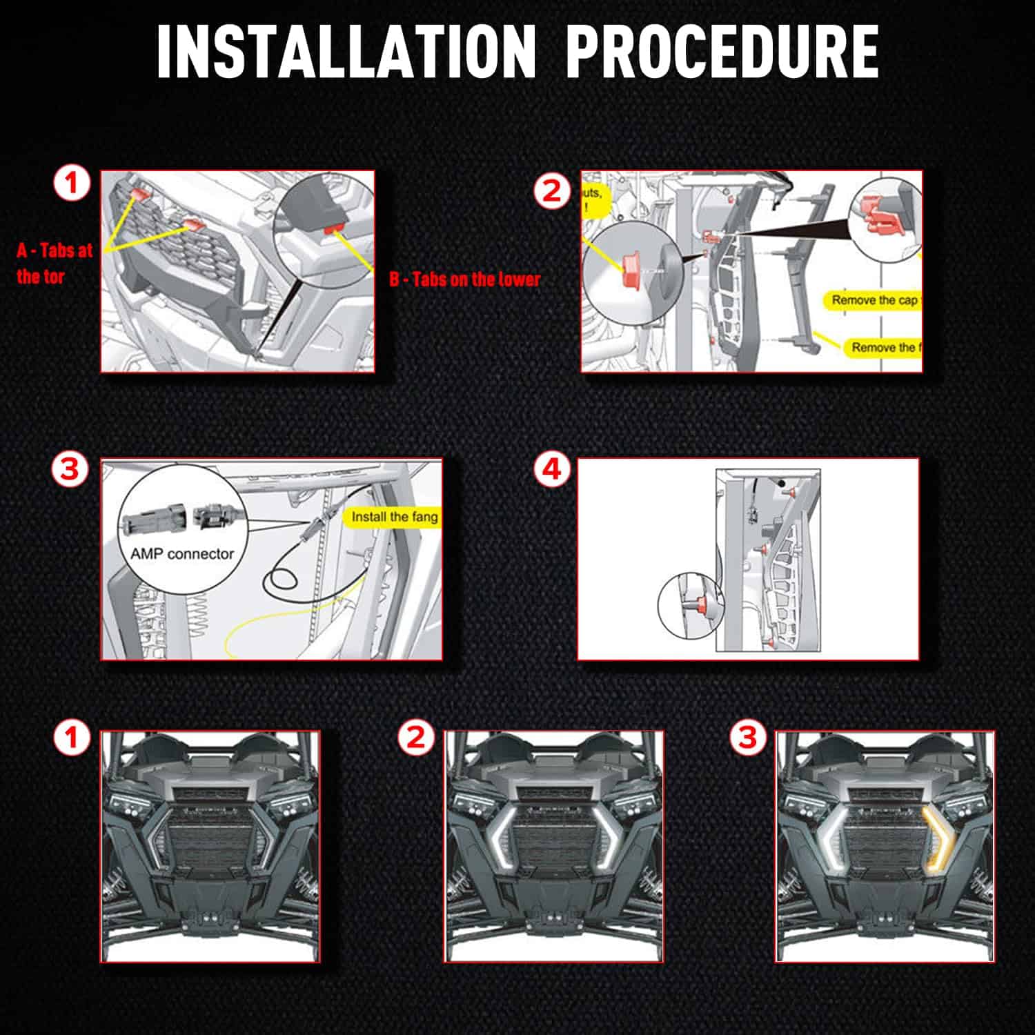 Luces LED delanteras de firma con luces de señal de garras para Polaris RZR X3 ¡Este kit de luces llamativas hará que tu vehículo se destaque de verdad! Personalizará el aspecto de tu vehículo y ayudará a iluminar el camino al atardecer y por la noche. Fácil de instalar, viene con 1 par de luces de señal y manual de instalación. VOLTAJE DE FUNCIONAMIENTO: 12V CC LED SUPER BRILLANTE 5050SMD POTENCIA 3W VIDA ÚTIL: Promedio de 50000 horas MATERIAL LENTE PMMA MATERIAL DE LENTE DE POLICARBONATO DURADERO A PRUEBA DE AGUA IP67