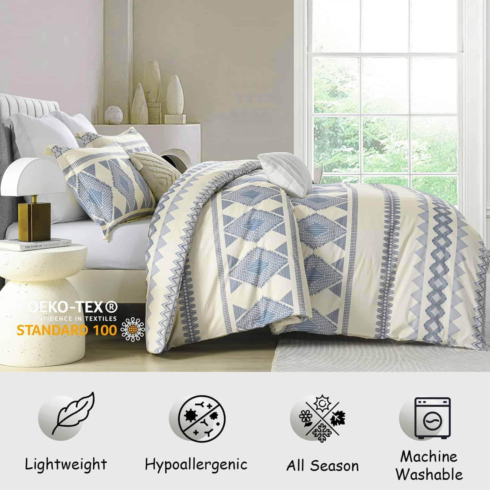 Esta funda de edredón Queen de Bedduvit está diseñada para ofrecer comodidad y estilo a tu dormitorio. Con un diseño boho a rayas, agrega un atractivo chic y bohemio a tu decoración. Esta funda de edredón está hecha de 100% algodón, lo que la hace suave y amigable con la piel, perfecta para ti y tu familia. La artesanía prelavada garantiza una excelente suavidad y con cada lavado se vuelve más suave y fresca. La funda de edredón queen viene con 8 lazos en cada una de las esquinas para evitar que el edredón se amontone o se desplace. El cierre de cremallera oculto facilita la colocación y retirada de la funda de edredón, además de garantizar un uso más duradero que el cierre de botón. Además de ser una capa protectora para tu edredón, esta funda de edredón también puede usarse como una manta delgada en las noches calurosas de verano para asegurarte noches cómodas. El juego incluye una funda de edredón boho queen de 90″ x 90″ y 2 fundas de almohada de 20″ x 26″. Disfruta de un sueño más saludable y confortable durante todo el año con esta lujosa funda de edredón de tamaño queen de Bedduvit.