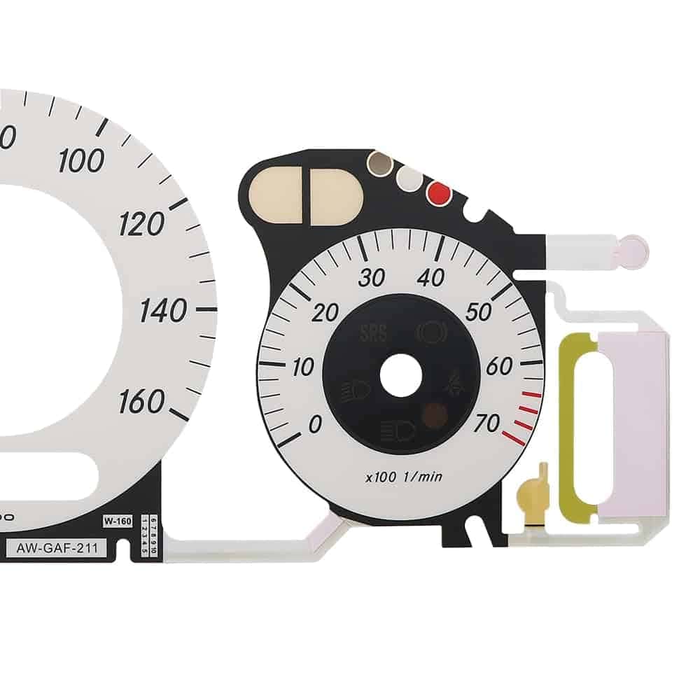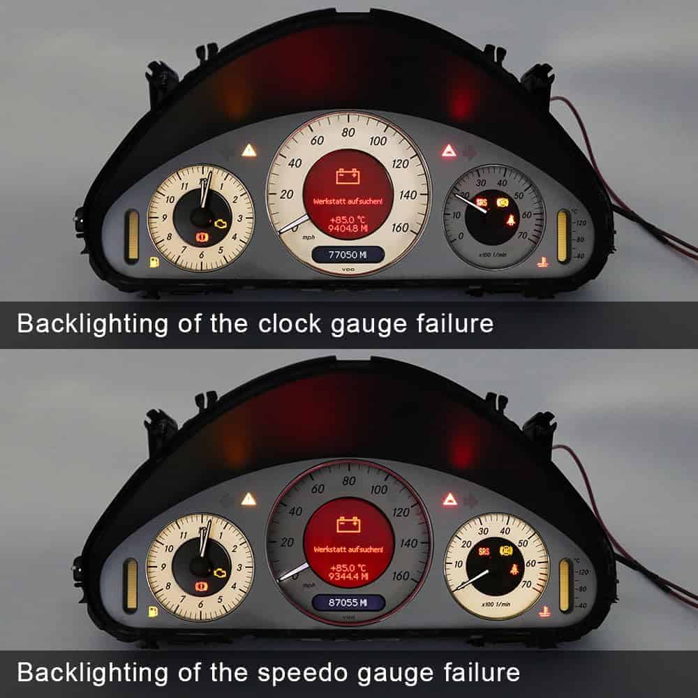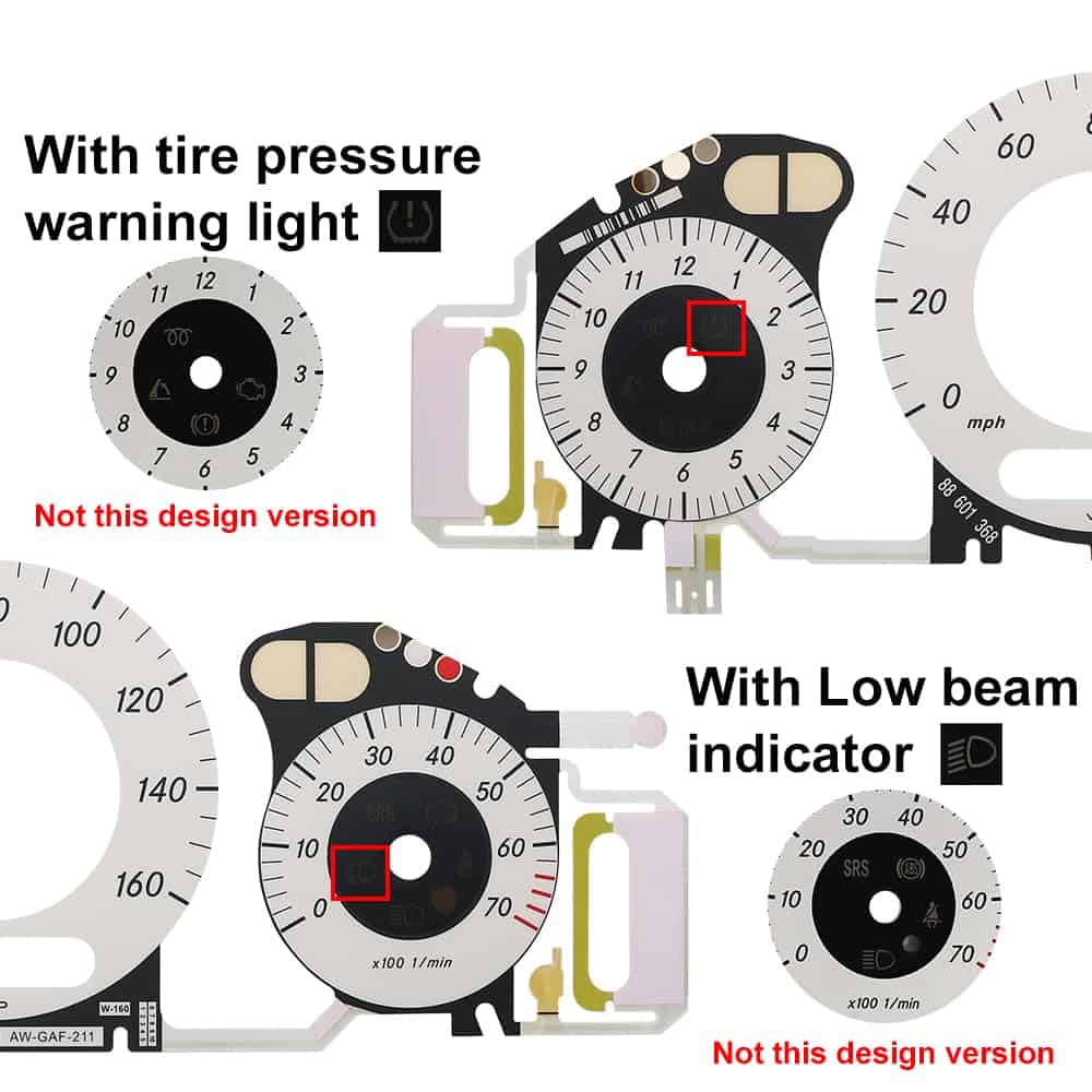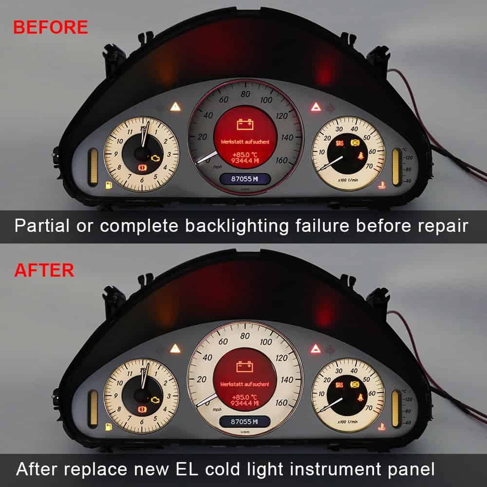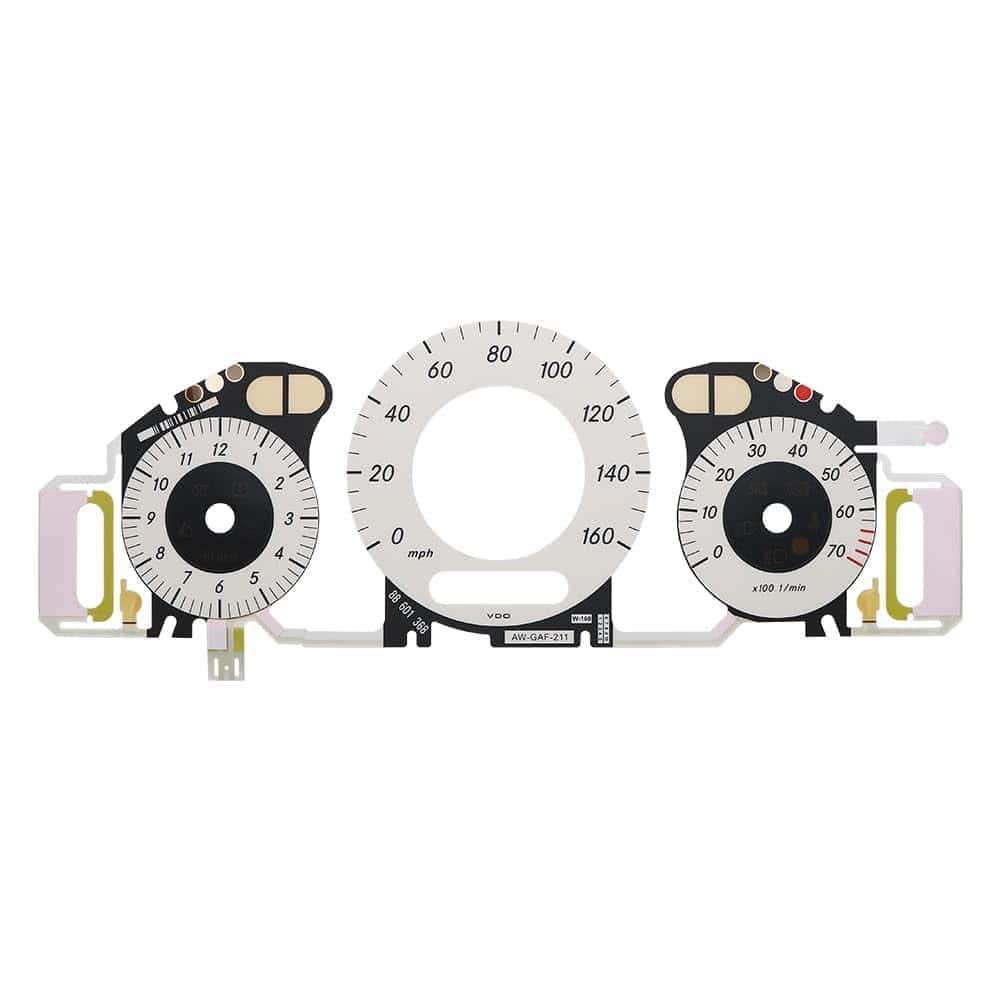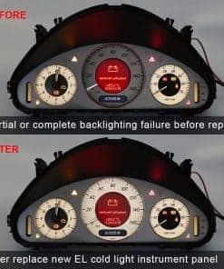 Medidor de Panel de Instrumentos con Sobrepuesto de Carátula y Panel de Luz Fria EL de Reemplazo para Mercedes W211 W209 C219 160MPH Negro 1. Este es un medidor de panel de instrumentos de alta calidad de posventa nuevo y sin usar con panel de luz fría EL de reemplazo para Mercedes W211 W209 C219. 2. Compatible con Mercedes E-Class W211 E320 E350 E500 E55 E63 (2002-2009); CLK-Class W209 (2002-2010); CLS-Class C219 (2004-2010) 3. Números de referencia del instrumento OEM A2115409911, A2115405111, A2115405211, A2095406911, A2095403311, A2095404347, A2195404611, A2195401411, A2195405111, A2195405911 4. Con luz de advertencia de presión de neumáticos e indicador de luz baja. 5. Si la retroiluminación del reloj, velocímetro o tacómetro dejó de funcionar. Suena simple de arreglar, ¡simplemente reemplace las bombillas! ¡Incorrecto! No hay bombillas. La forma correcta de hacerlo es reemplazar el panel de luz fría EL (Electro Luminesence) del panel de instrumentos. 6. Los paneles de luz fría EL utilizados para la retroiluminación del dial del tablero son propensos a desvanecerse. Si fallan por completo, haciéndolo imposible ver los medidores en la oscuridad. El panel EL de reemplazo que suministramos encaja exactamente en su lugar, restaurará nuevamente su retroiluminación intermitente o inoperativa. 7. Nota: este es un sobreimpresión de la cara del medidor con panel de luz fría EL combinados juntos. Para reparar la decoloración de la retroiluminación de su dial, debe desprender la vieja cara del medidor fallida con su panel EL y reemplazarla por la nuestra. 8. Característica: Color: Blanco Escala de velocidad máxima: 160MPH La cara del medidor se combina con el Panel de Luz Fria EL.