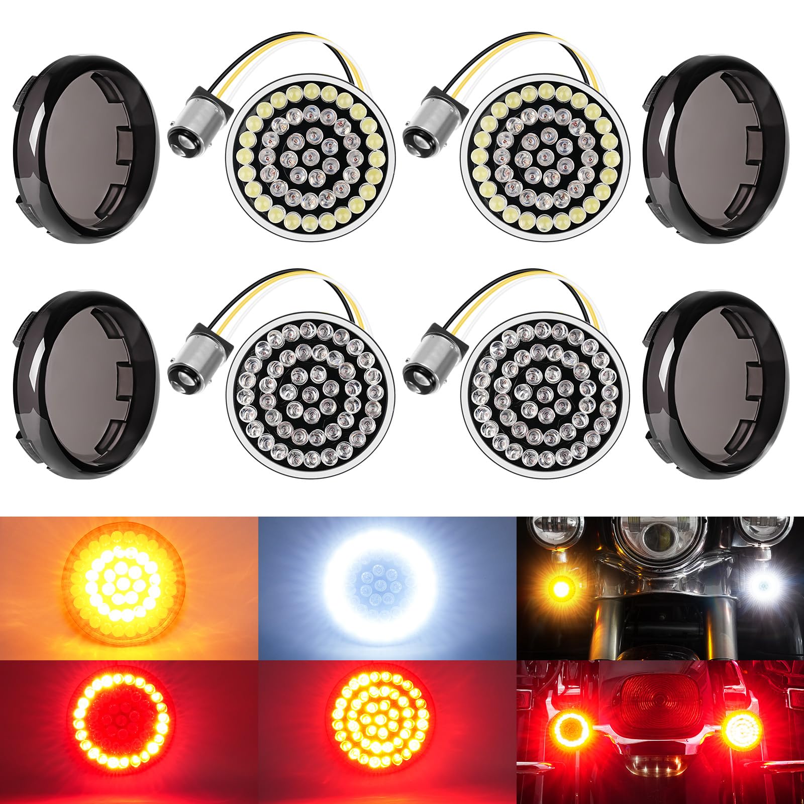 5. Paquete contiene: 1 par de luces de giro delanteras 1157. 1 par de bombillas de luces de giro traseras 1157. 2 pares de lentes de luz de giro ahumadas. 6. Nota: No compatible con 3 1/4 Algunos modelos pueden necesitar resistencias de carga o relés decodificadores para garantizar que las luces de giro LED se enciendan con toda la potencia y evitar que las bombillas LED 1157 parpadeen de forma excesiva, advirtiendo o mostrando cualquier código de error de mal funcionamiento en el tablero de instrumentos.