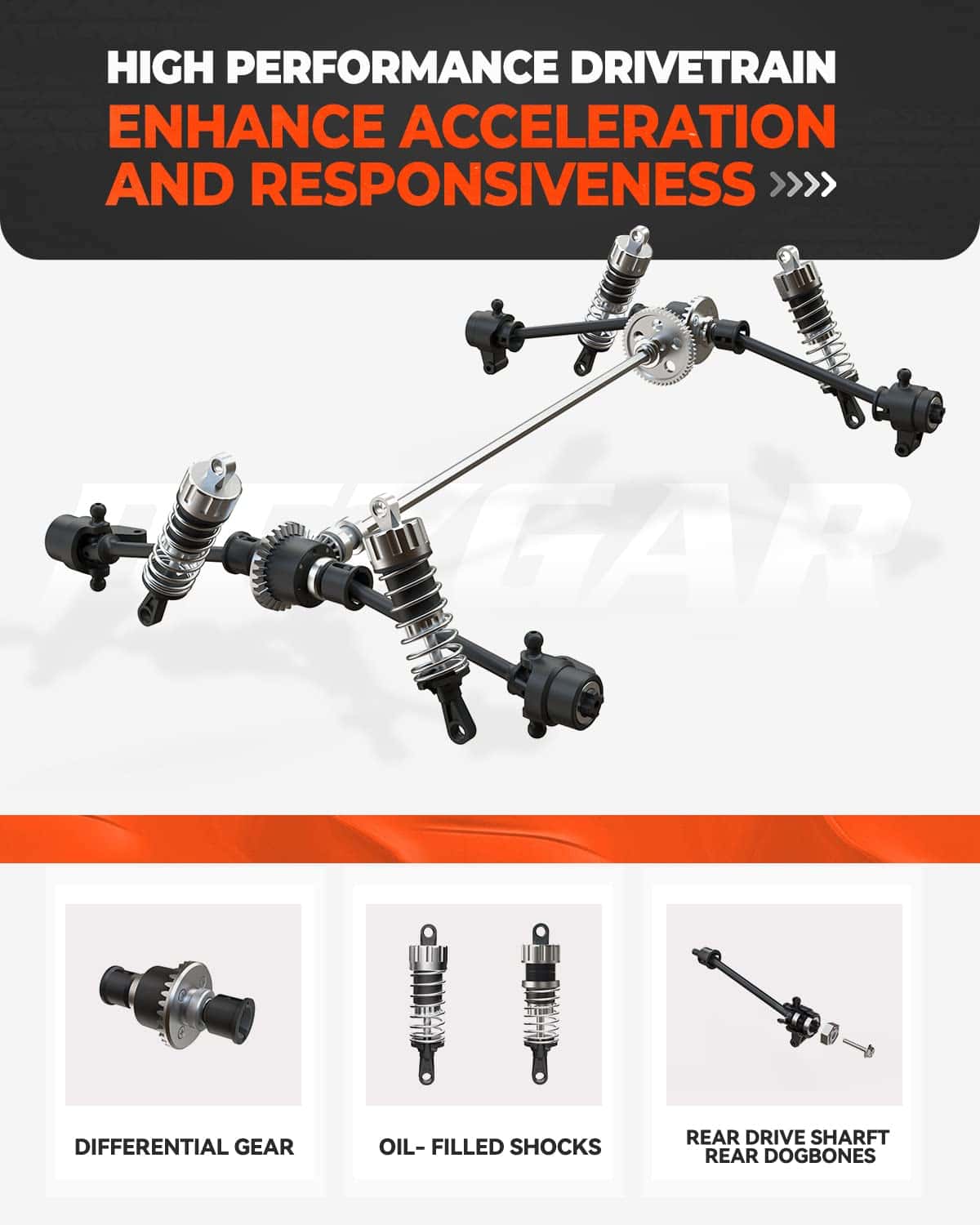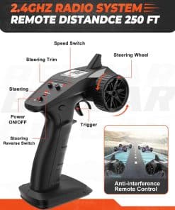3. Motor de Alta Velocidad: Equipado con un Motor Escobilla 390L que genera una mayor potencia para el RC Truck. Esto ha supuesto una gran mejora en la aceleración y rotación, lo que permite al coche rc tener una velocidad rápida que aporta una mayor competitividad en la carrera de arrastre.