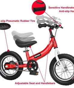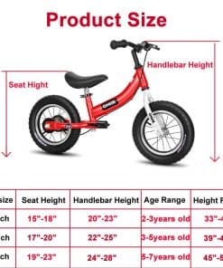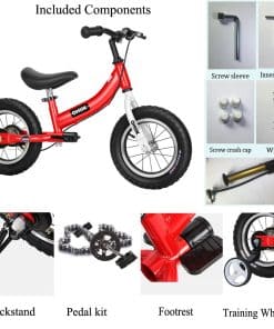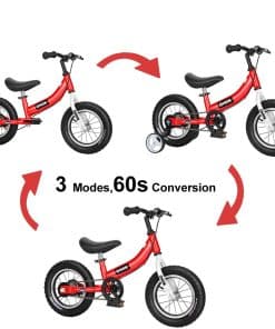 La resistente estructura está hecha de acero de alto carbono, es ligera y duradera. El freno de mano es sensible y seguro, freno trasero de retención, puede ayudar a los niños a frenar sin necesidad de usar sus zapatos. Los neumáticos de goma neumática son amplios, resistentes al desgaste y a prueba de reventones. El asiento y manillar ajustables hacen que la bicicleta de equilibrio 2 en 1 crezca a medida que lo hace su hijo, no se necesitan herramientas para ajustar el asiento. Es fácil encontrar la posición más cómoda. El manillar de la bicicleta de equilibrio puede lograr un giro de 360 grados, tiene un buen efecto protector para los niños durante el proceso de conducción, evitando daños a los niños. La bicicleta de equilibrio 2 en 1 viene con un 85% ensamblado, solo necesita ensamblar pedales, manillar y rueda delantera. Todas las tallas vienen con kit de pedales, ruedas de entrenamiento, pata de cabra, reposapiés antideslizante de equilibrio, herramientas de montaje, pequeña bomba de neumáticos, no es necesario comprar otros accesorios. Antes de ensamblar, por favor vea el video de ensamblaje. Tamaños disponibles de rueda de 12 14 16 pulgadas, Rojo y azul, rosa están disponibles, apto para niños y niñas. 12 pulgadas se adapta a edades de 2 a 3 años, 14 pulgadas se adapta a edades de 3 a 5 años, 16 pulgadas se adapta a edades de 5 a 8 años. (Por favor, tenga en cuenta la altura de los niños).