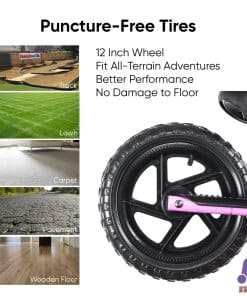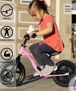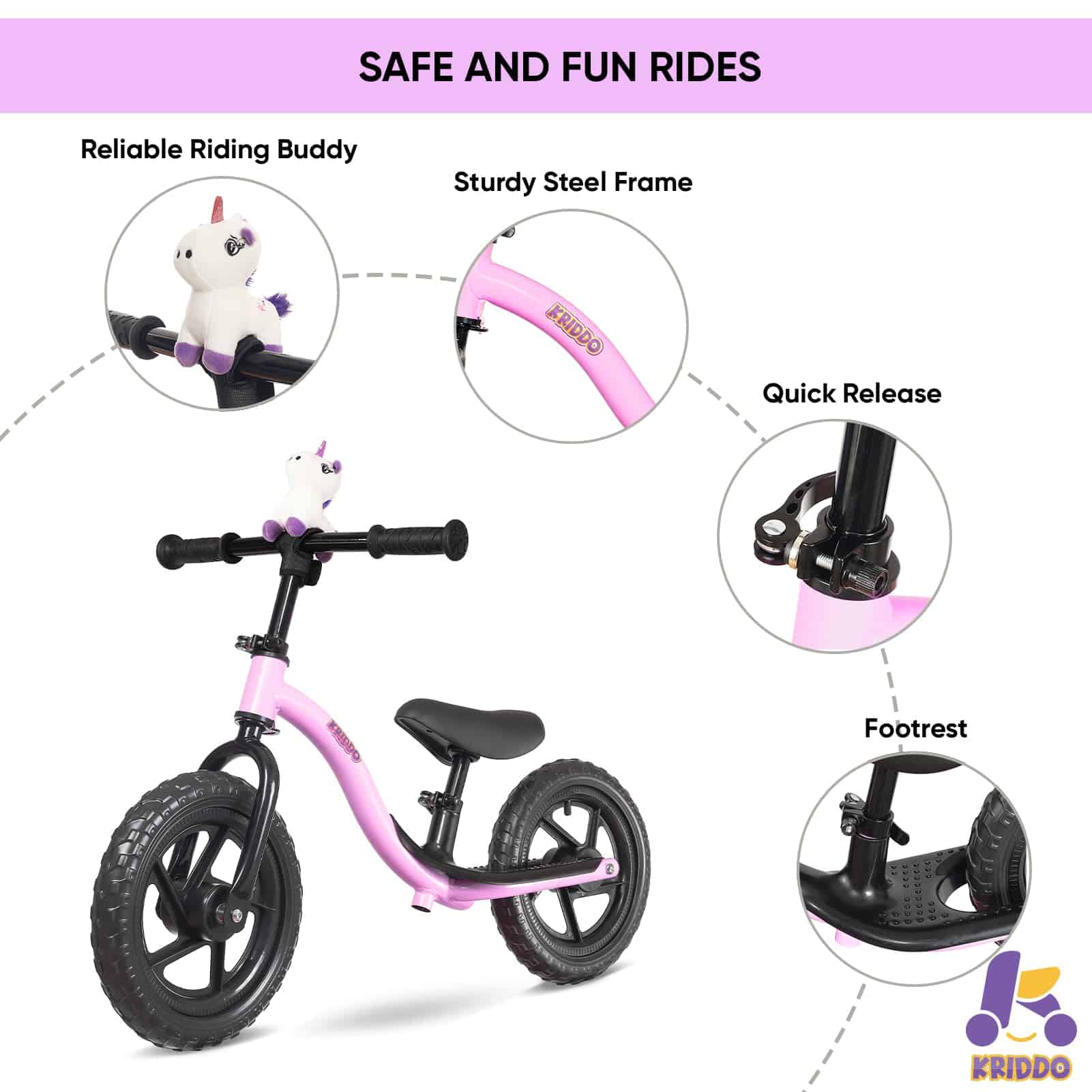 Una forma divertida de introducir a los pequeños toddlers a montar bicicletas, esta bicicleta de equilibrio para niñas y niños les permite empujar, pararse y caminar alrededor del exterior con un marco resistente y un diseño amigable para los niños de 24 meses a 5 años de edad. Cada bicicleta de equilibrio también viene con un peluche pequeño que se convierte en el compañero perfecto para montar. Puedes elegir entre tres amigos animales diferentes incluyendo un unicornio o un tiranosaurio rex. Nuestra bicicleta de equilibrio para niños también está diseñada con un reposapiés ancho debajo del asiento donde los pies descansan para ayudarles a aprender a levantar los pies y equilibrarse cuando están deslizándose. Vital para desarrollar la confianza en sí mismos y el equilibrio. Queremos que los niños se sientan fuertes y estables cuando se mueven en césped y aceras, por eso agregamos neumáticos resistentes a los pinchazos en la parte delantera y trasera de cada bicicleta de equilibrio para niños de 5 años y riders de 24 meses. Junto con un manillar de agarre suave de goma, un asiento de PU suave y un marco de acero al carbono, esta bicicleta de equilibrio para niños ofrece dirección limitada para ayudar a prevenir el vuelco o el sobre giro cuando están aprendiendo a girar.