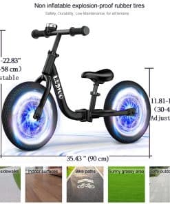 2. Ajustabilidad Flexible – Los manillares ajustables y la altura del asiento suave garantizan que su hijo disfrute de la experiencia de conducción más cómoda. Equipado con neumáticos antipinchazos de 12 pulgadas adecuados para suelos interiores lo suficientemente resistentes para aventuras al aire libre.