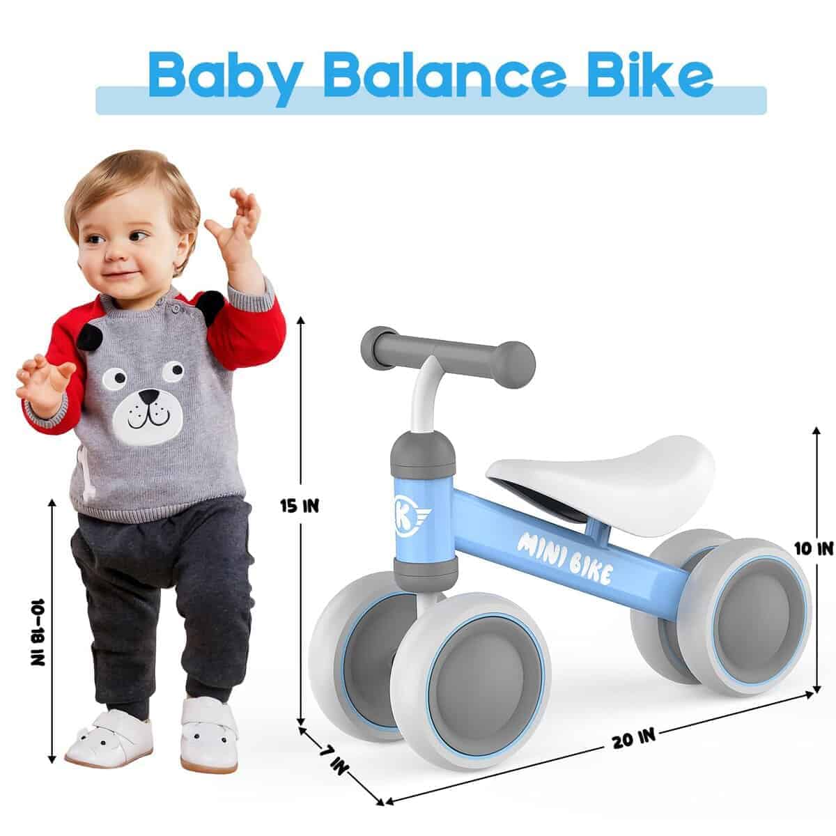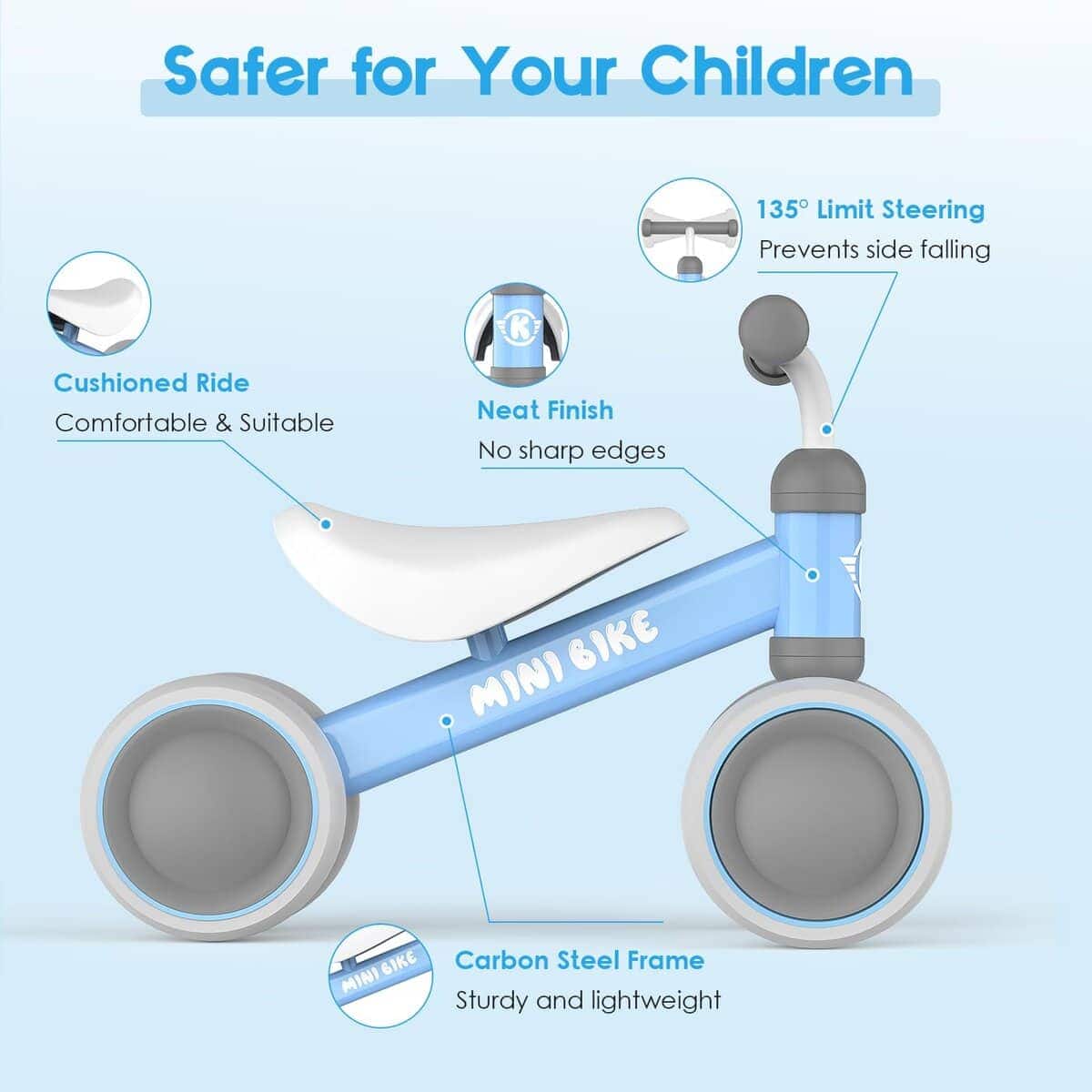 3. CONSTRUCCIÓN FUERTE: Marco de acero al carbono engrosado, mayor capacidad de carga, cómodo y absorbente de choques, no teme a los golpes con regalos para niños de 1 año. Estructura estabilizada de cuatro ruedas con diseño de bajo centro de gravedad para la seguridad de tu bebé. La bicicleta para bebé pesa solo 1,6 kg (3,6 libras), tanto tú como tu hijo pueden llevar la bicicleta de equilibrio para niños fácilmente!.