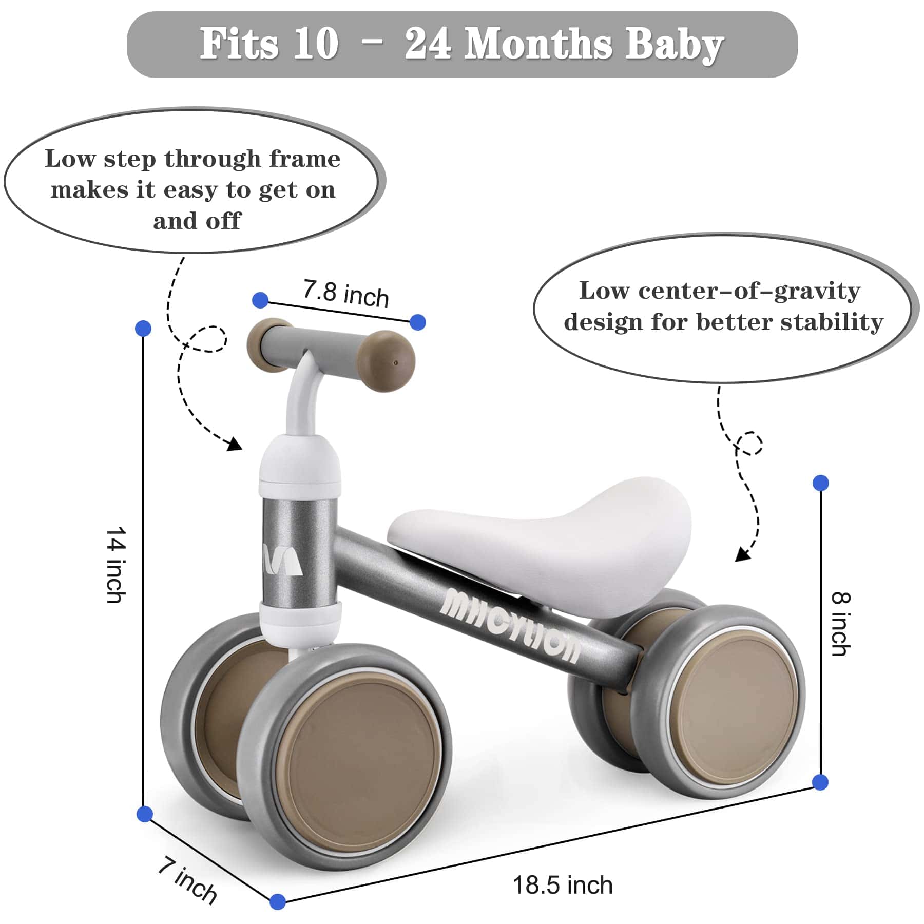 4. Diseño considerado: La bicicleta de equilibrio está equipada con acero al carbono resistente, un manillar de EVA antideslizante y un asiento suavemente acolchado. Diseño de bajo centro de gravedad para mayor estabilidad, tamaño perfecto para bebés de 10-24 meses.