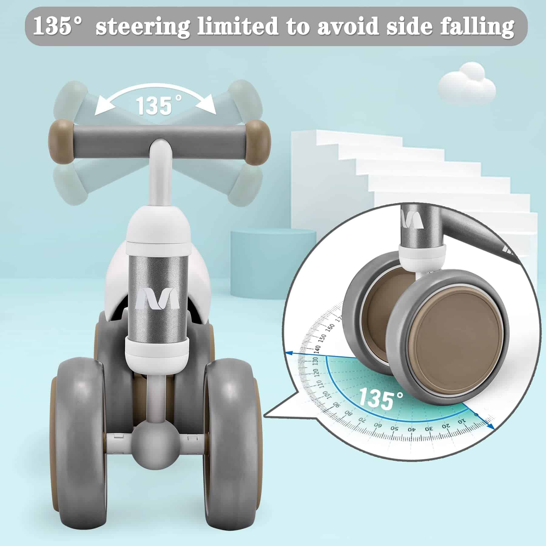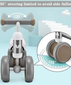 2. Diseño sin pedales: Ruedas completamente cerradas y ampliadas aseguran la seguridad de los pies del bebé; dirección limitada a 135° para evitar caídas laterales; marco extremadamente bajo que facilita que su pequeño se mueva y se suba y baje.