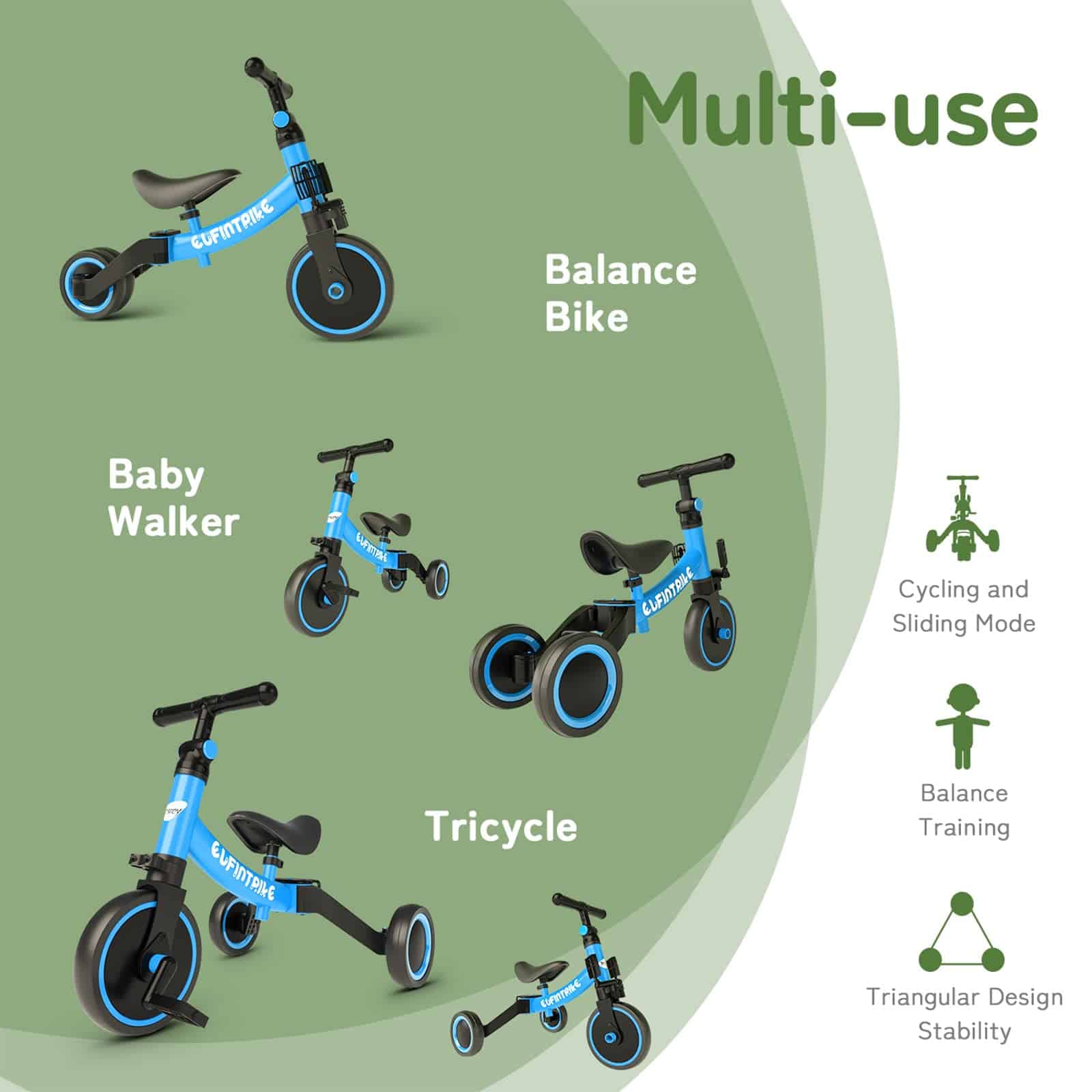 2. Actualización 5 EN 1: 1: Triciclo sin pedales (aprender a caminar) 2: Andador para bebé sin pedales (etapa de aprendizaje de caminar 2) 3: Triciclo con pedales (aprender a montar) 4: Andador para bebé con pedales (Aprender a montar etapa 2) 5: Bicicleta de equilibrio sin pedales (para deslizarse).